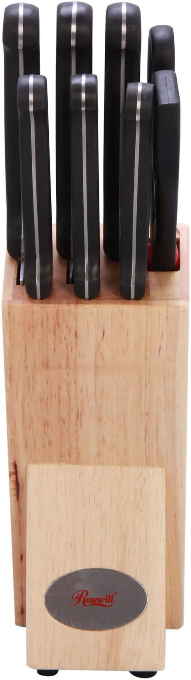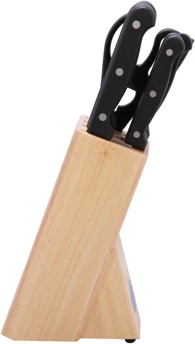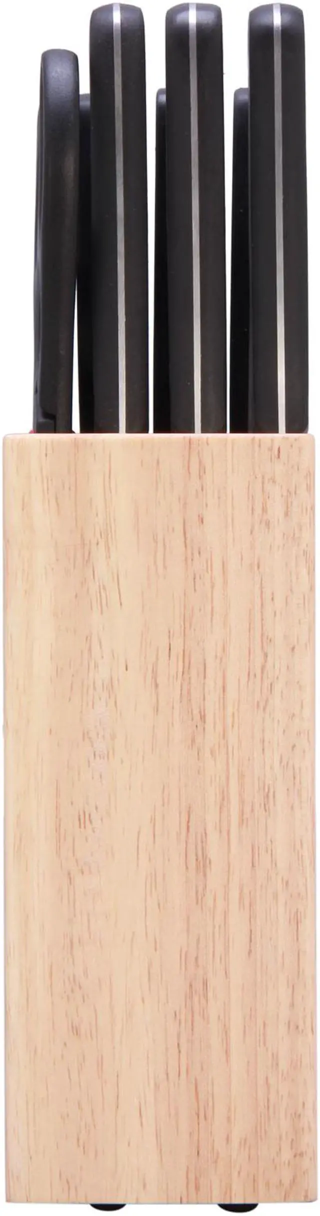 Wood Cutlery BlockThe wood block, made of pine and rubber, allows easy, safe access and neatly organizes your knives when not in use.