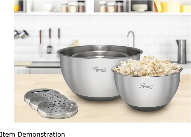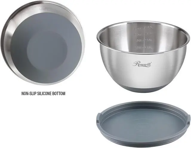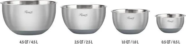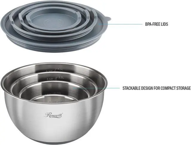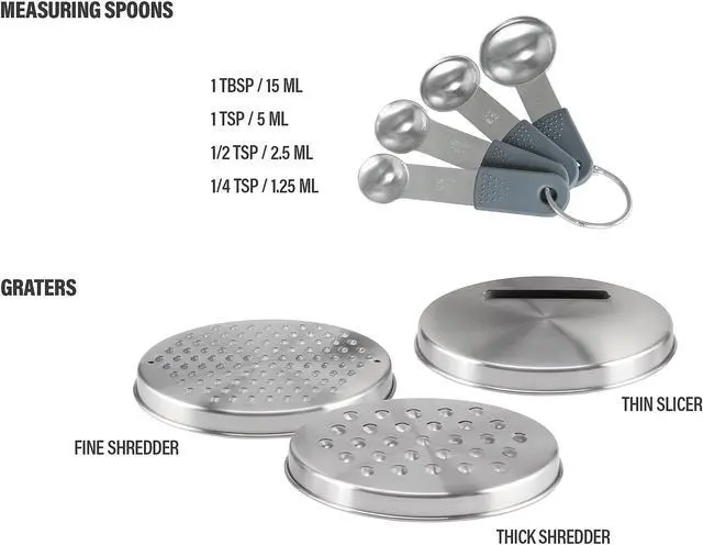 | Features | 4 BPA-Free Lids Total; 1 with Removable Middle Section to Attach Graters or Use As Splash Guard Lid to Shield Splatter During Mixing 4 Stainless Steel Mixing Bowls with Engraved Measurements: 4.5 QT / 4.5 L 2.5 QT / 2.5 L 1.0 QT / 1.0 L 0.5 QT / 0.5 L 4 Stainless Steel Measuring Spoons: 1 tbsp / 15 mL 1 tsp / 5 mL 1/2 tsp / 2.5 mL 1/4 tsp / 1.25 mL 3 Stainless Steel Grater Inserts: Thick Shredder for a variety of cheeses, vegetables, fruit Fine Shredder for strips of cabbage, carrots, ginger Thin Slicer for paper-thin potatoes, zucchini, radish and more Heat and Rust Resistant 304 Food Grade Stainless Steel Bowls and Measuring Spoons Mixing Bowls Feature Non-Slip Silicone Bottoms |