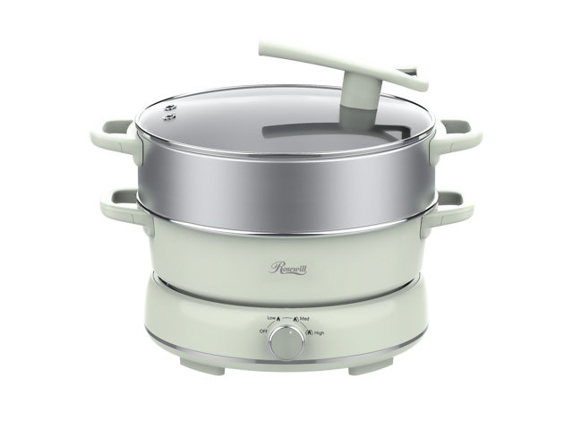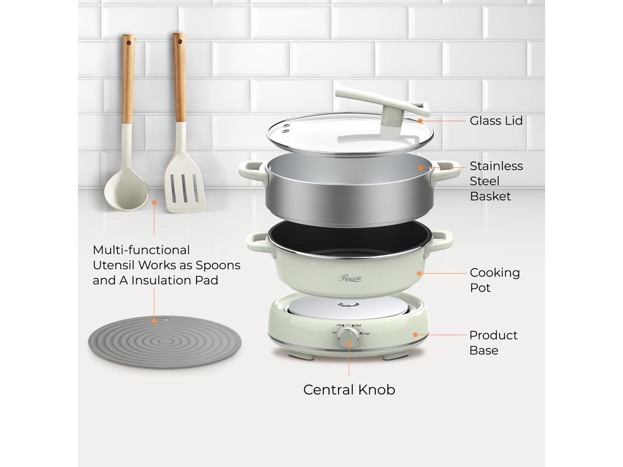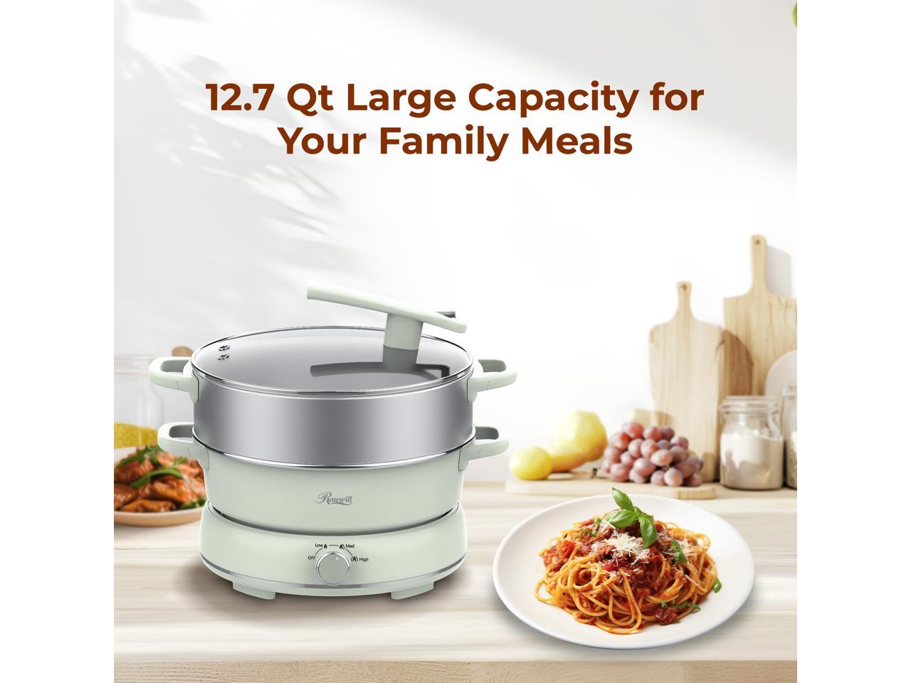 Rosewill 12.7 QT Electric Hot Pot with Multiple Functions, Split Design with 11.8 inch Wider Cooking Pot and SUS Steam Basket, 1600W High Power, Includes Utensils - Light Green