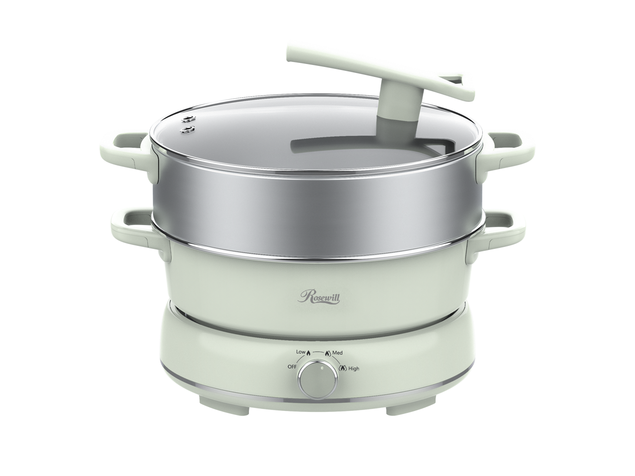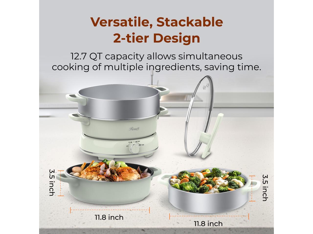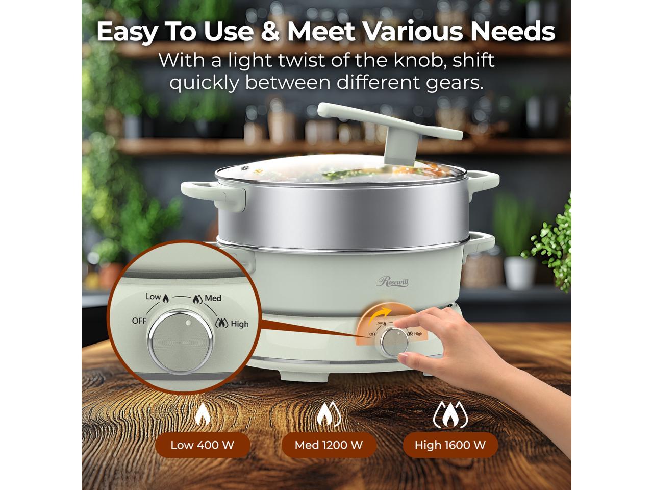 Rosewill 12.7 QT Electric Hot Pot with Multiple Functions, Split Design with 11.8 inch Wider Cooking Pot and SUS Steam Basket, 1600W High Power, Includes Utensils - Light Green