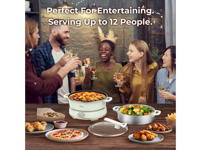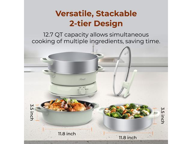 - 12.7QT large capacity electric hot with 2 tier separate hot pot(6.3QT) and steamer(6.4QT), it can steam varied foods simultaneously.