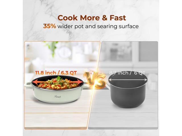 - 35% larger searing surface than other leading 8Qt multicookers. It cooks large meals for groups rapidly, with no long waits – perfect for families serving up to 12 people.