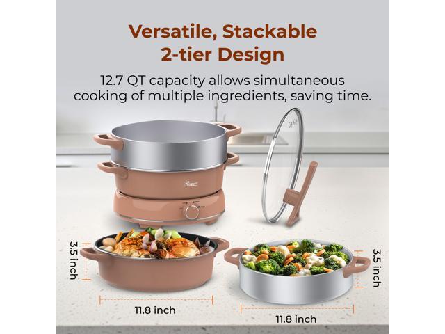 - 12.7QT large capacity electric hot with 2 tier separate hot pot(6.3QT) and steamer(6.4QT), it can steam varied foods simultaneously.