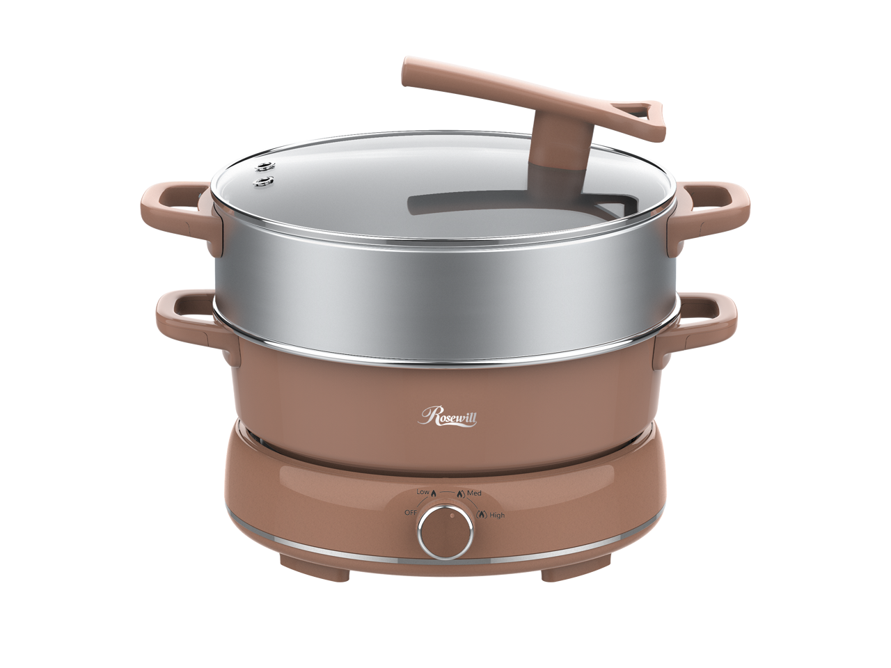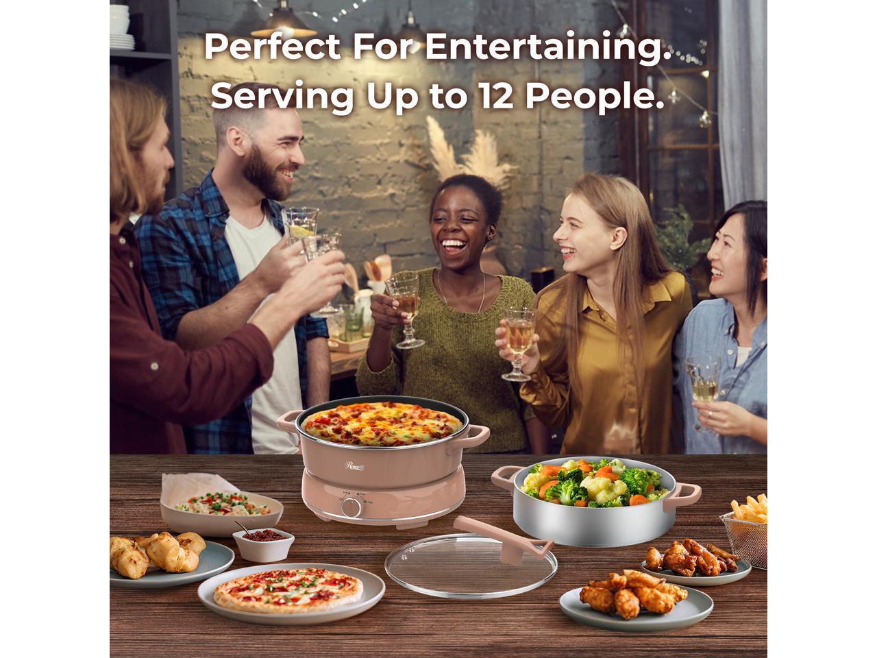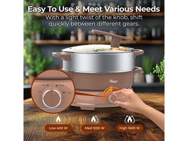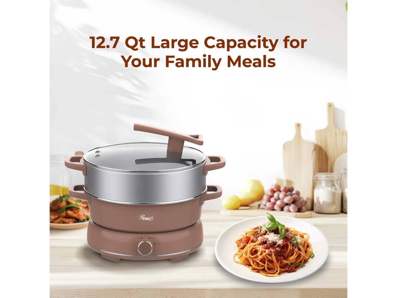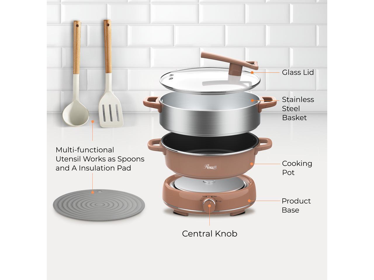 Rosewill 12.7 QT Electric Hot Pot with Multiple Functions, Split Design with 11.8 inch Wider Cooking Pot and SUS Steam Basket, 1600W High Power, Includes Utensils - Mocha