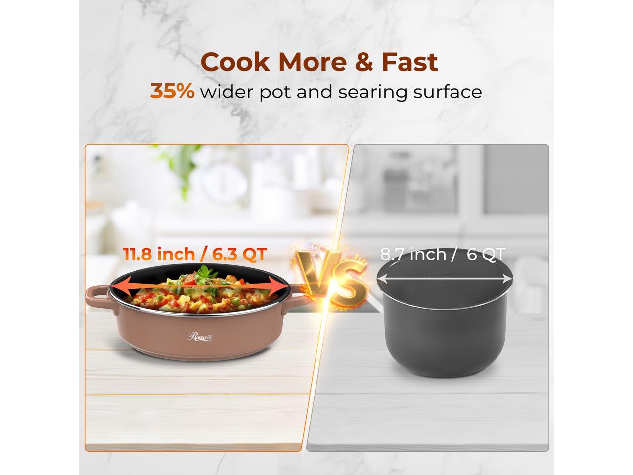 - 35% larger searing surface than other leading 8Qt multicookers. It cooks large meals for groups rapidly, with no long waits – perfect for families serving up to 12 people.