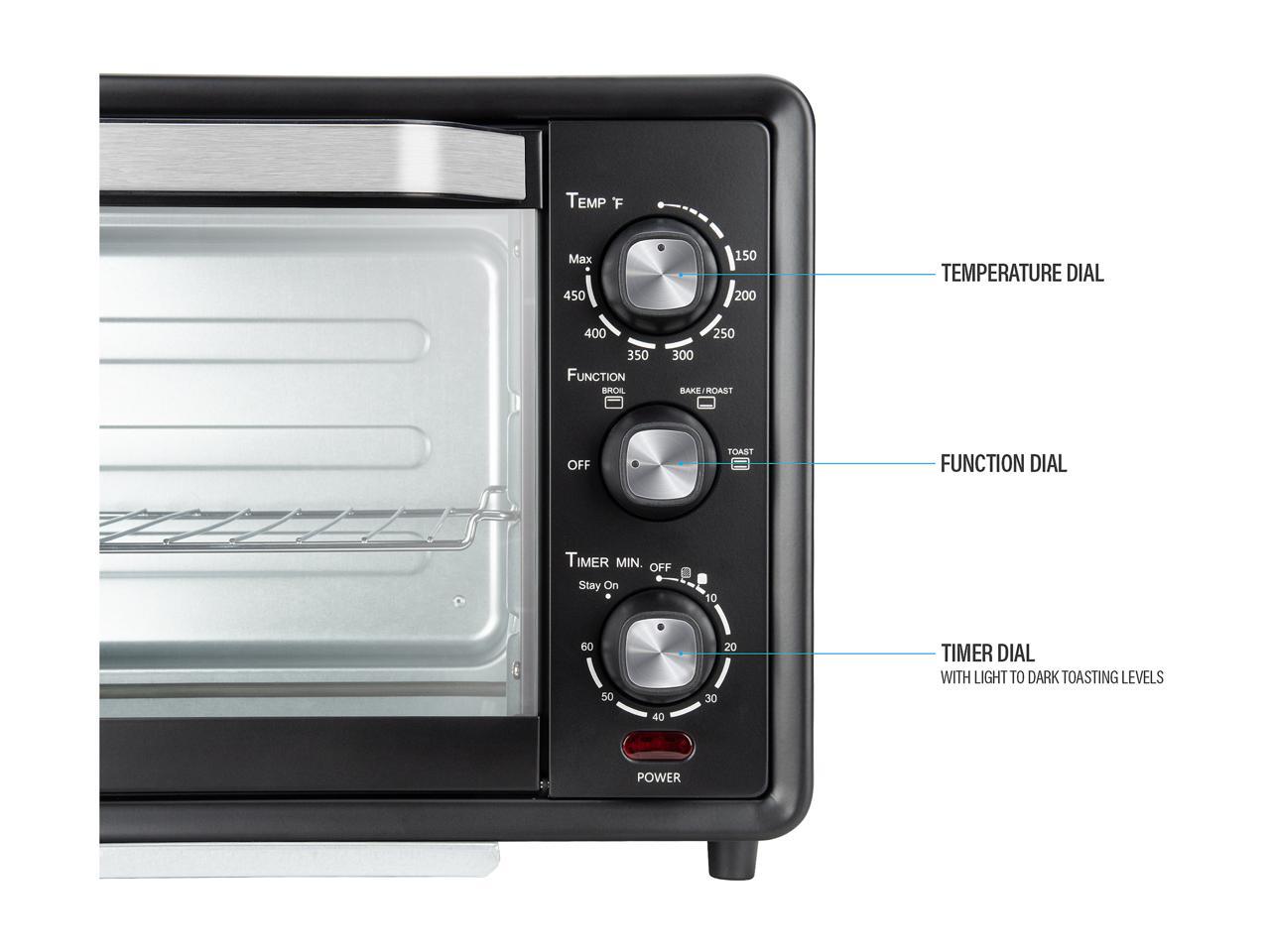 - [BUILT-IN TIMER] Adjust the temperature between 150 and 450 degrees Fahrenheit and set the timer up to 60 minutes to quickly and easily cook food.