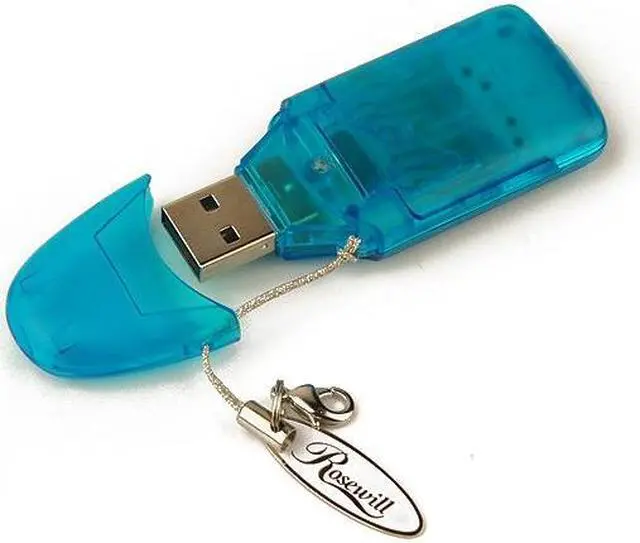 The Rosewill RSD-CR103 card reader plugs into your USB port, and doubles as a thumb drive. The reader handles SD and MMC media out of the box, and can also handle miniSD, microSD, and MMCmicro media, with optional adapter. The unit is USB-powered, so there’s no power cord, and is USB 2.0 compliant. Supports Windows 2000, ME, and XP operating systems, and Mac OS 9.1 and OS X.