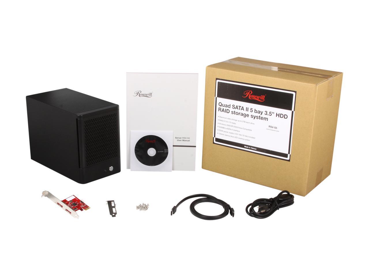 Rosewill RSV-S5 - 5-Bay 2.5" & 3.5" Hot-Swap Storage Encl. System - RAID 0 / 1 / 5 / 10 / 5 + Spare / Spanning / JBOD - 120mm Fan, Port Multiplier, Tray Design - Controller Card Bundle