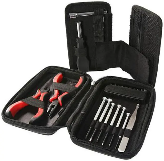 | Specifications | 1. Long nose pliers 4.5" 2. Diagonal pliers 4.5" 3. Tweezers 4. 1/4"sockets (1/4":4-6-8-10mm) 5. Screwdriver bit 6. Extension bar 1/4"x3" 7. Bit holder 8. Mini screwdrivers Ph #1,#0,(-)1.4,2.0,2.4,3.0 9. Zipper bag |