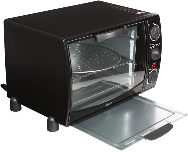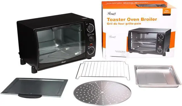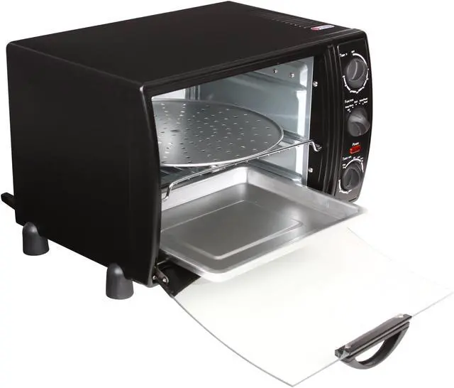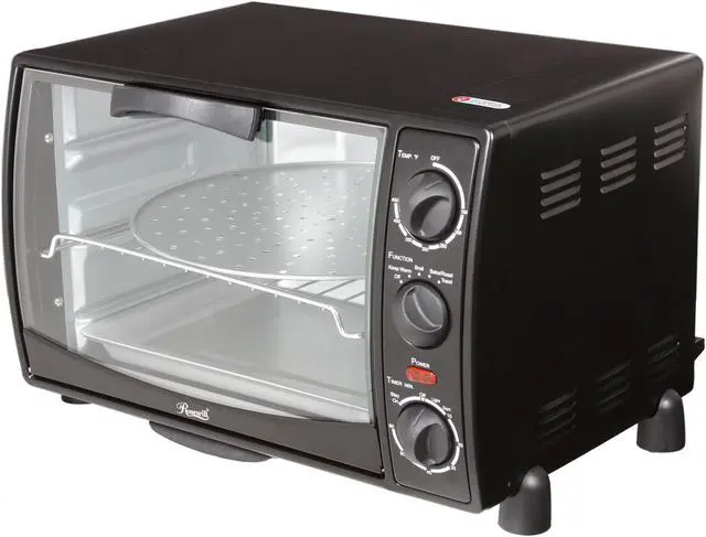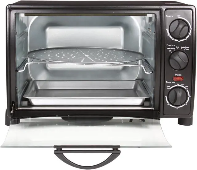 A perfect addition to your kitchen, the Rosewill RTOB-11001 toaster oven boasts 1500w high power and ample space for preparing 6 slices of bread or 12" pizza at a time. Baking cookies for kids or treating guests to broiled chickens are as easy as a snap - just choose from bake, broil, toast and warm to match your meal. You'll also appreciate the transparent door that lets you keep an eye on your food without losing any heat. Program cooking time with 60-minute timer. Oven rack, bake pan, crumb tray and pizza pan are included for out-of-the-box use.