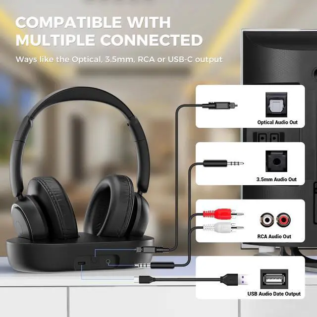 | Included Components | TV Transmitter Charging Base, Type C,Optical,AUX 3.5mm,RCA Audio Cables, User Manual, Wireless Headphones for TV |