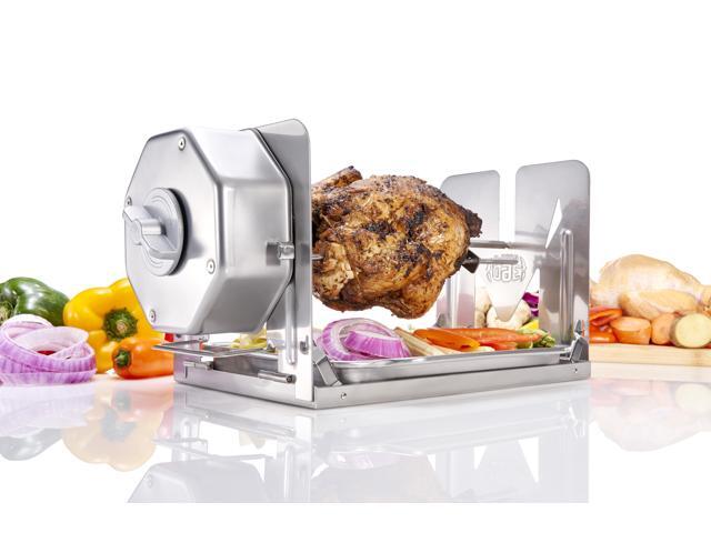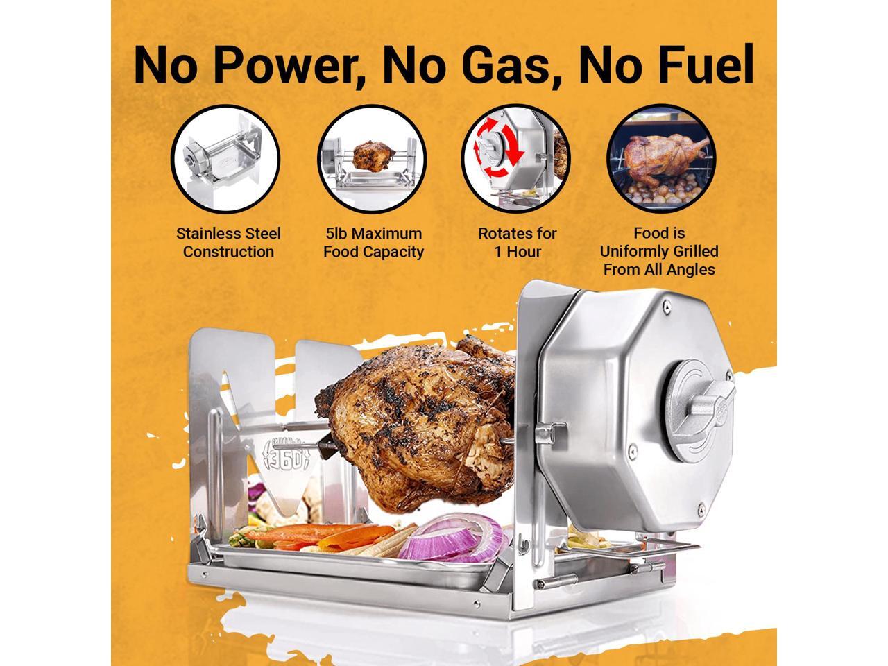 - NON-ELECTRIC & CORDLESS 100% mechanical design, no cords, no batteries, no fuel. Wind it up and enjoy hands-free rotisserie cooking anywhere.