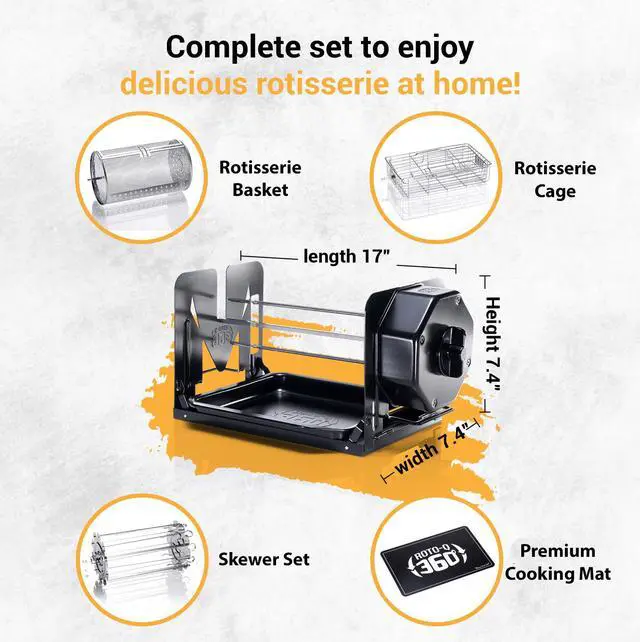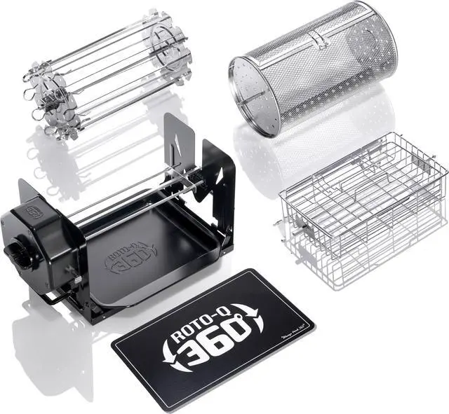 Tired of dry chicken and uneven cooking? The Roto-Q 360 brings you perfect rotisserie results every time indoors or outdoors with no cords, no batteries, and no fuel. Just wind it up and let the mechanical Power Core rotate your food for up to 60 minutes of hands-free cooking.