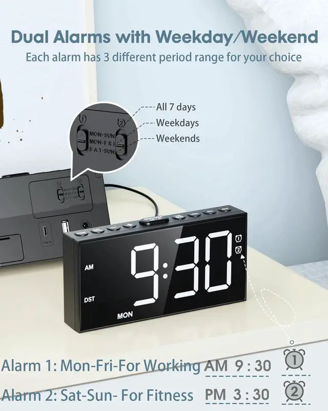 The separate 2 alarms allow you to set different wake up alarms for weekdays and weekends. Also useful to set two alarms on the same day for different schedules, suitable for kids, couples, roommates.