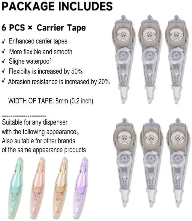 This refill is Suitable for a creative pressed correction tape. The writing correction tape adopts the retractable design, 6 Refills for BITOSEE White Retractable Correction Tape,Features: -multiple choice. -Press design, convenient to use. -A small body can be put in carrying bag and pencil case. Specifications: Material: Plastic Size: 11cm x 2.7cm approxWhite Tape Measures: 5mm x 6M
