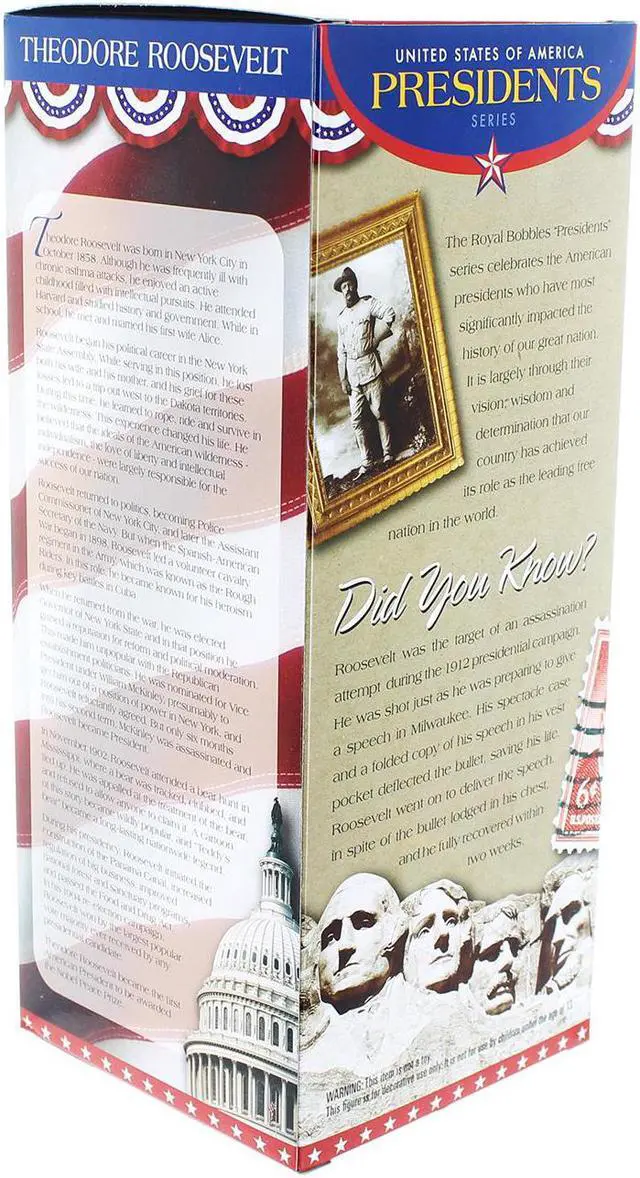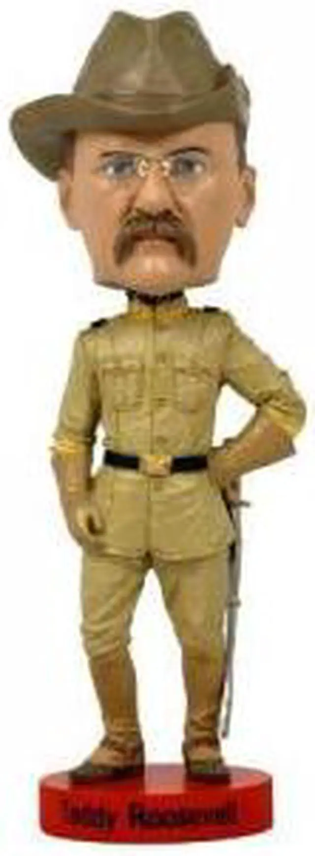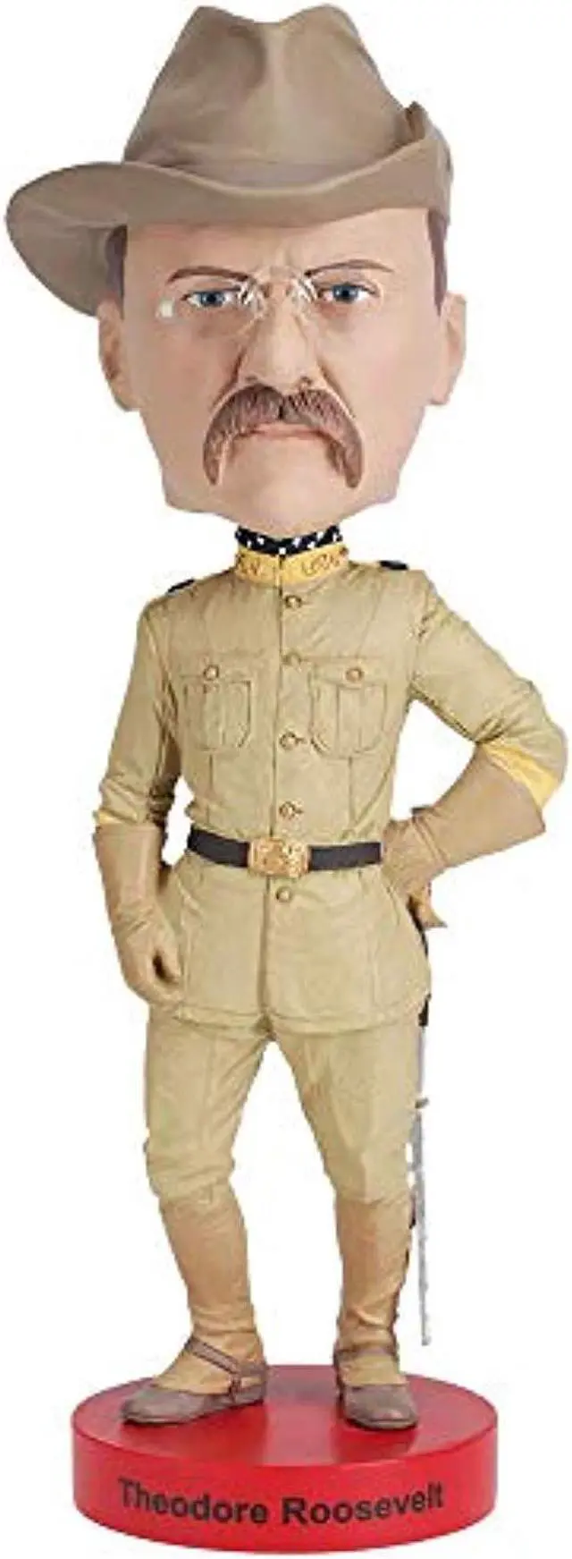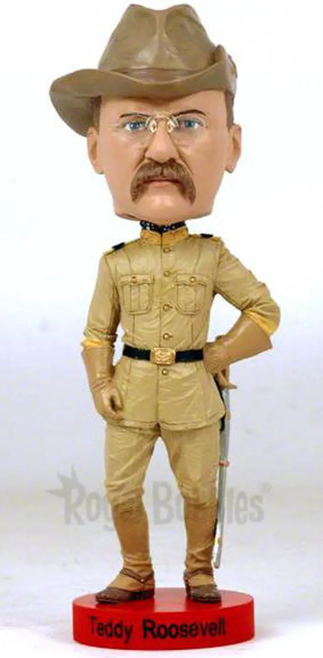 Over 8" tall, heavyweight polyresin construction. Finest quality Teddy Roosevelt bobblehead ever produced. Features clear spectacles. Depicted in iconic Rough Riders uniform. Ships in colorful collectors box.
