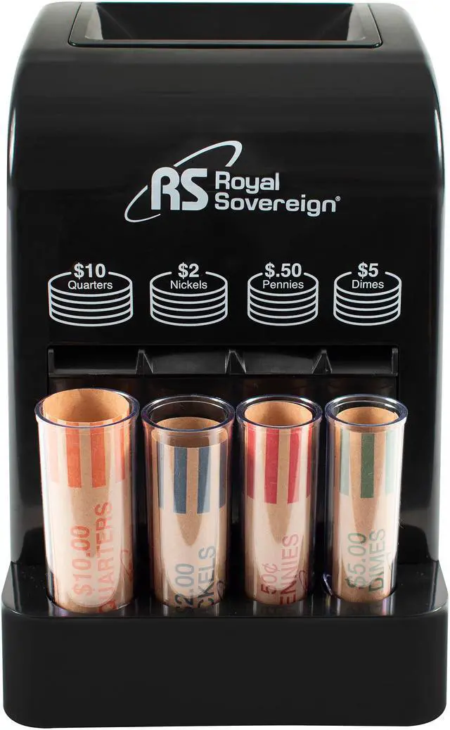 The Royal Sovereign DCB-175B Coin Sorter is a 1 row coin counter with fast sorting speed. Quickly counts 120 coins per minute and can hold up to 75 coins at a time. Straight to wrapper feature allows the user to sort coins directly into coin wrappers. Easy open top cover allows the manual removal of foreign objects. Ideal for homes in need of an accurate and reliable coin sorting and counting solution.