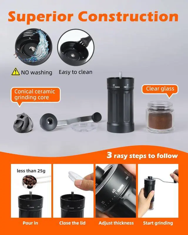 Enjoy freshly ground coffee anytime with our versatile manual coffee grinder featuring 40 adjustable grind settings. The conical ceramic burr ensures a uniform grind for a perfect brew every time, whether you prefer espresso or French press.