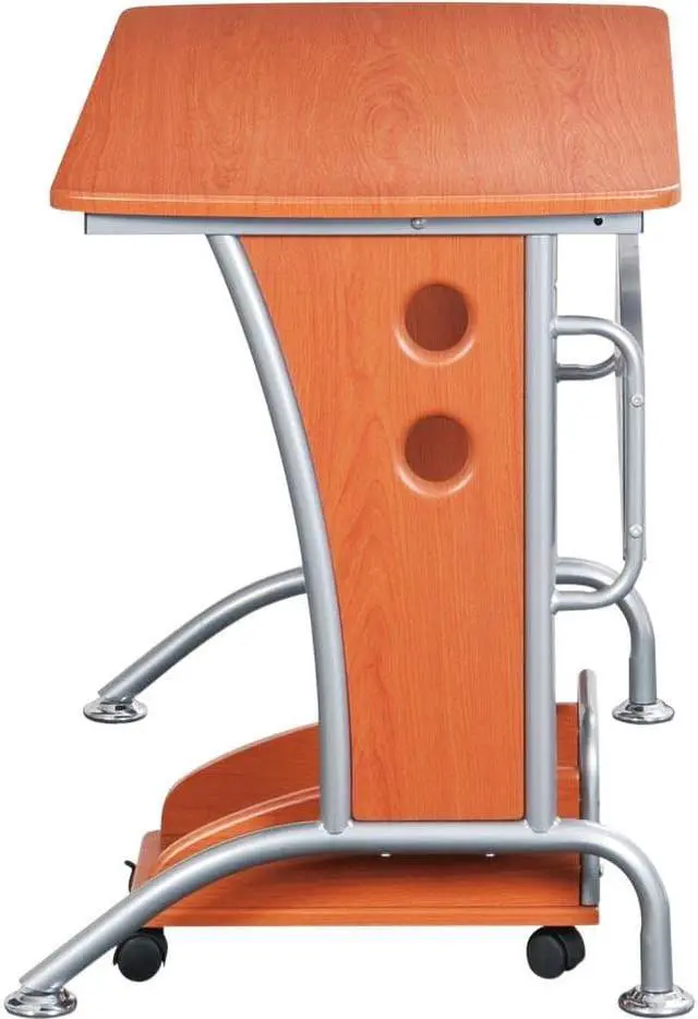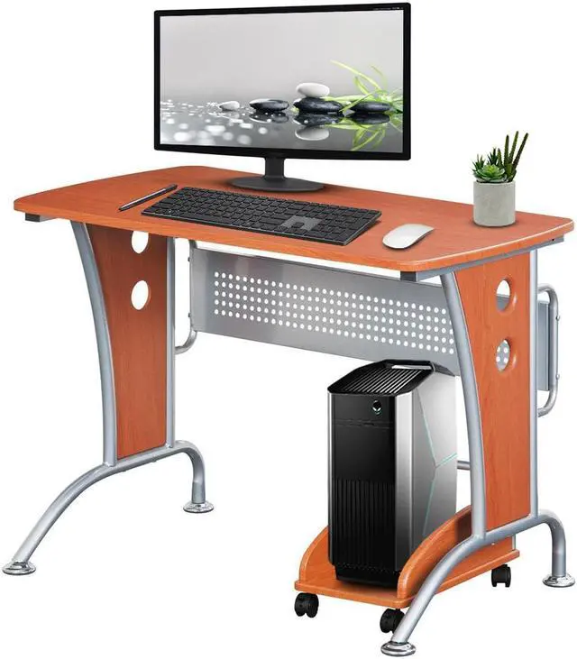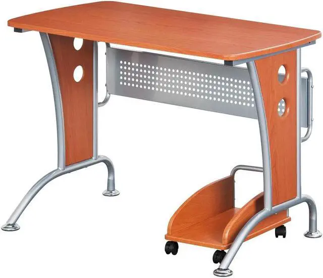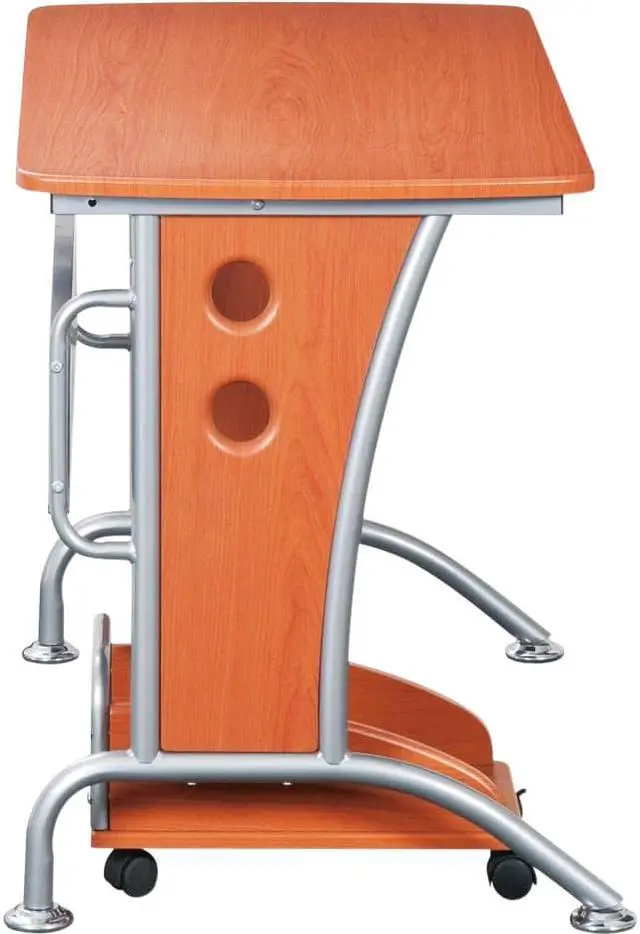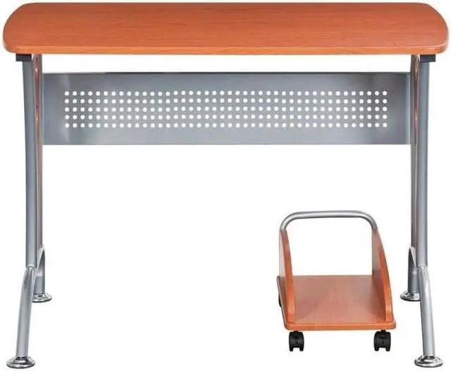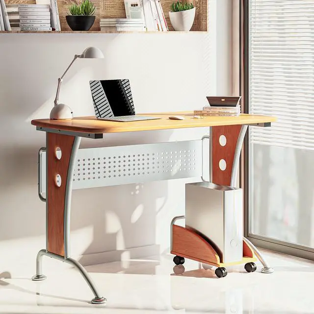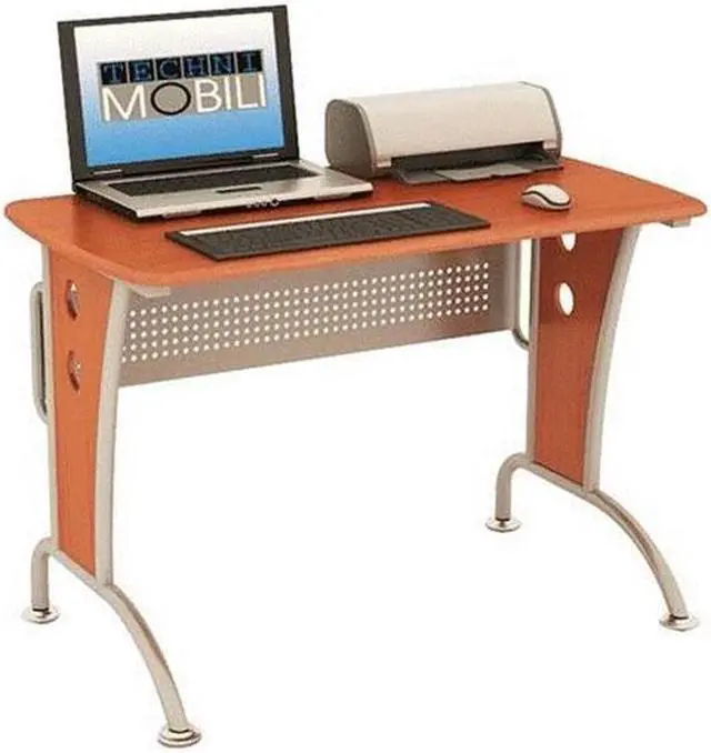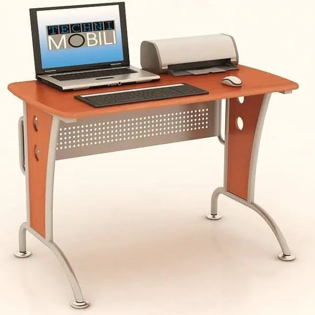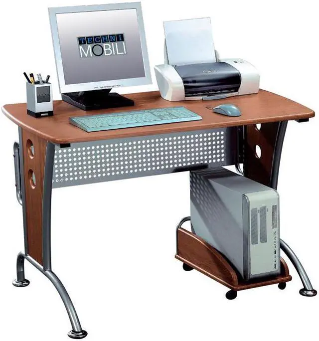 This Techni Mobili Modern Computer Desk is the perfect computer workstation for an office desk with great design facilities. The modern and refined desk is made of MDF panels in Dark Honey color with a moisture laminate veneer atop a scratch-resistant powder-coated steel frame. It is ready and easy to assemble. This modern Techni Mobili Computer Desk has a modern refined design with an ample writing and work space perfect for students. It features a matching mobile CPU caddy and a rear perforated metal modesty panel which provides visual privacy below the work surface and covers cabling. The spacious desktop has a 120 lbs weight capacity. Color: Dark Honey.
