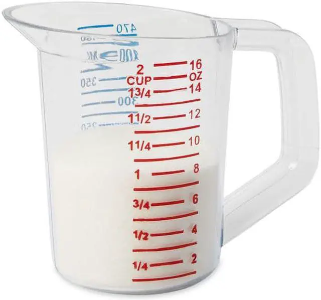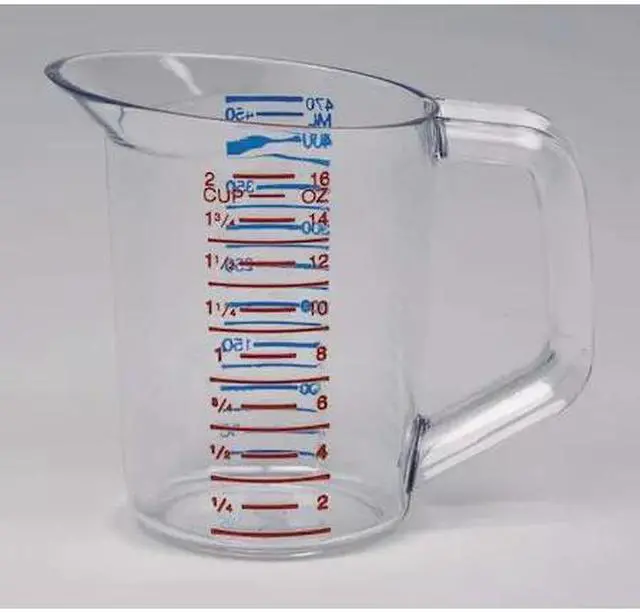 Measuring Cup, Overall Height 9 1/2 cm, Material Polycarbonate, Color Clear, Maximum Temperature Resistance 212 Degrees F, Capacity 0.5 qt, Dry/Liquid Dry, Liquid, Product Type Measuring Cup, Graduation Subdivisions 1 pt, Overall Length 14 cm, Overall Width 8 11/16 cm, NSF Certified Yes. This item has been restricted from sale in the following state (s): []