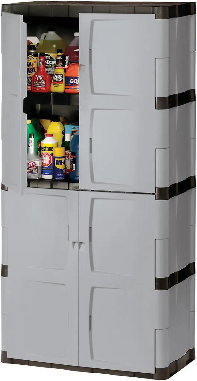 Maximize storage in your basement, garage or workshop with the Full Double Door Cabinet. It has a storage capacity of 27 cubic feet and holds a maximum of 690 lbs. The unique, snap together cabinet design combines quick and easy assembly with strength and durability. Lockable door keep valuables out of sight and chemicals safely away from children. - See more at: //www.rubbermaid.com/en-US/full-double-door-cabinet#sthash.d9wybXtA.dpuf