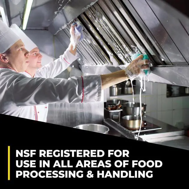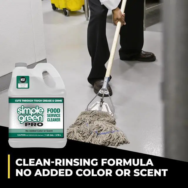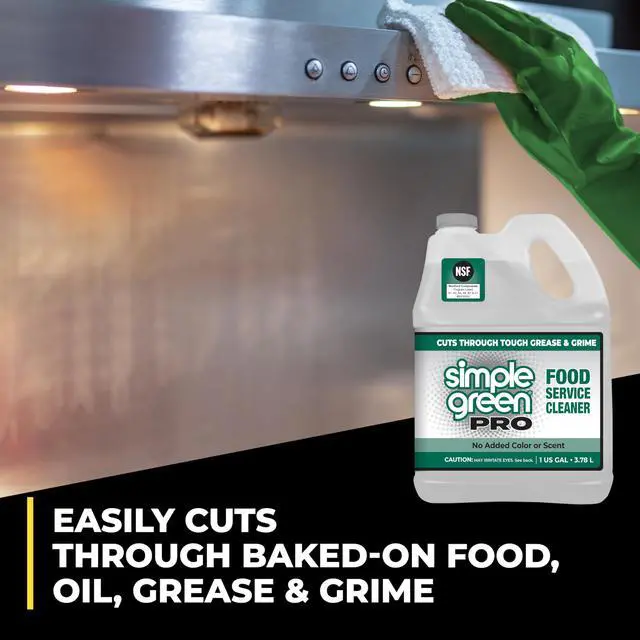 Simple Green PRO Food Service Cleaner is a powerful, professional-strength cleaner and degreaser that cuts through even tough baked-on foods, grease, and built-up grime without harsh chemicals. NSF registered A1, A2, A4, A8, B1 and C1 for use in commercial kitchens and other areas where food is prepared or handled. PRO Food Service Cleaner is the perfect choice for restaurants, bars, cafeterias, food trucks, bakeries, coffee shops, lunchrooms, and more. Works great on all washable surfaces including counters, walls, floors, appliances, cooking equipment, stoves, range hoods, utensils, and laundry. The clean-rinsing formula contains no added color or scent. Cost-effective concentrate can be diluted and used manually or in cleaning equipment.