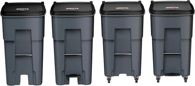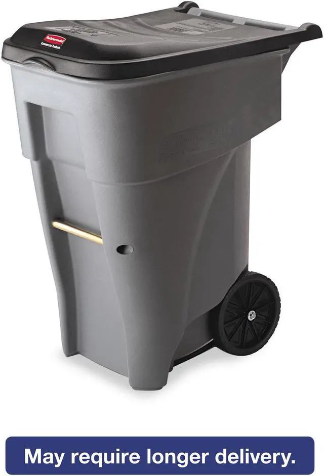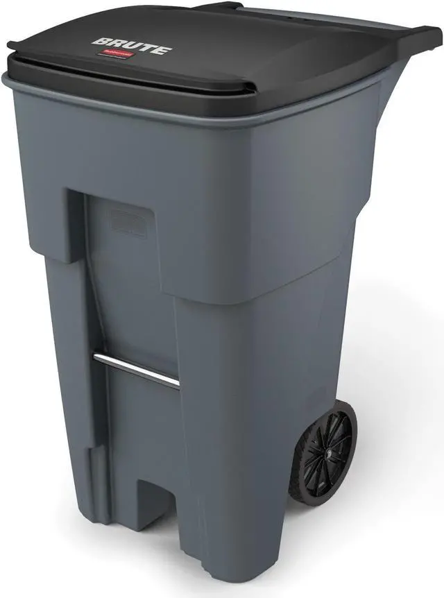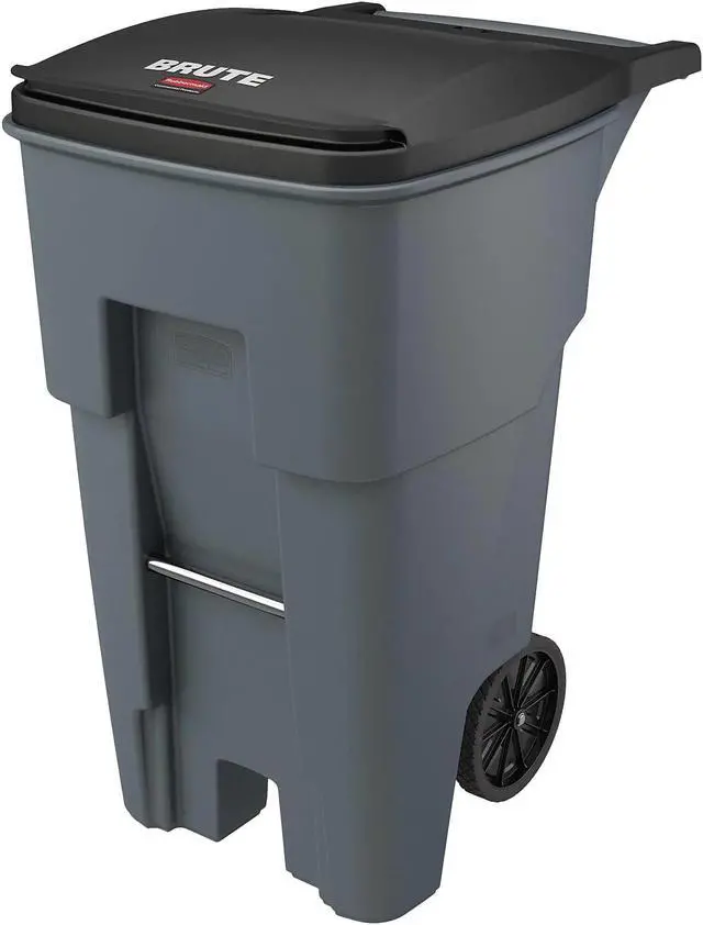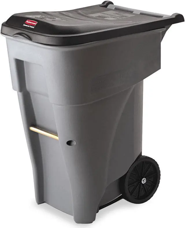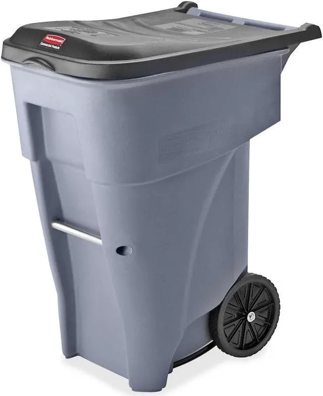 The Rubbermaid Commercial BRUTE Recycler Rollout Trash Can with Hinged Lid is the industry leader in waste and material handling applications. These seamless rectangular recycle bins are constructed of durable polyethylene with a hinged lid, integrated handle, inset wheels and are imprinted with the universal recycling symbol for increased waste management compliance. Heavy-duty polyethylene weighs less than aluminum or steel and resists cracking. The hinged lid open fully and locks against the recycling bins. A molded-in axle retainer adds strength while inset wheels make the recycle bin maneuverable and help prevent damage to walls and doorways. A molded-in catch bar makes the recycle bins compatible with automated and semi-automated lift systems for curbside garbage and recycling collection. This recycle bin contains an ultraviolet (UV) stabilizer to help prevent fading and discoloring. Waste Receptacle Type: Trash Container; Material(s): Polyethylene; Application: General Waste; Capacity (Volume): 65 gal.