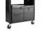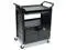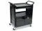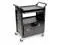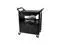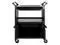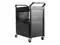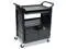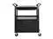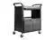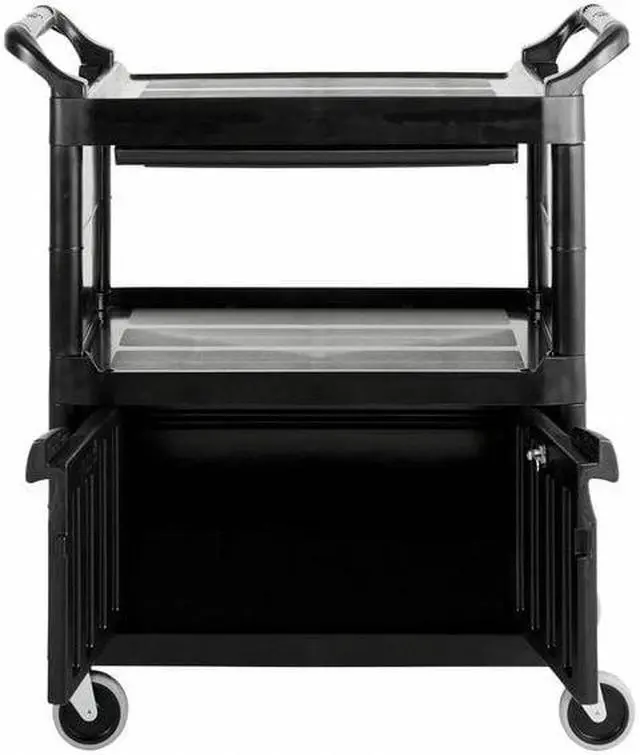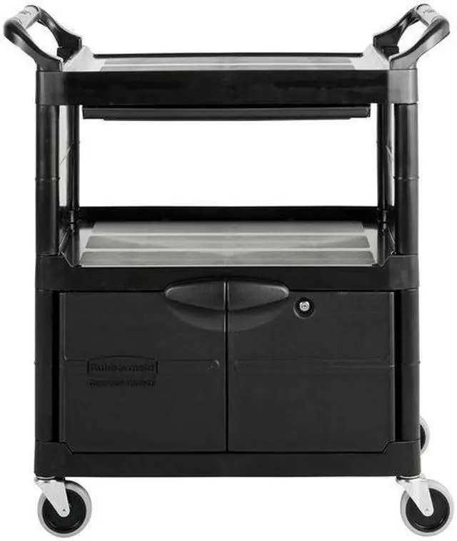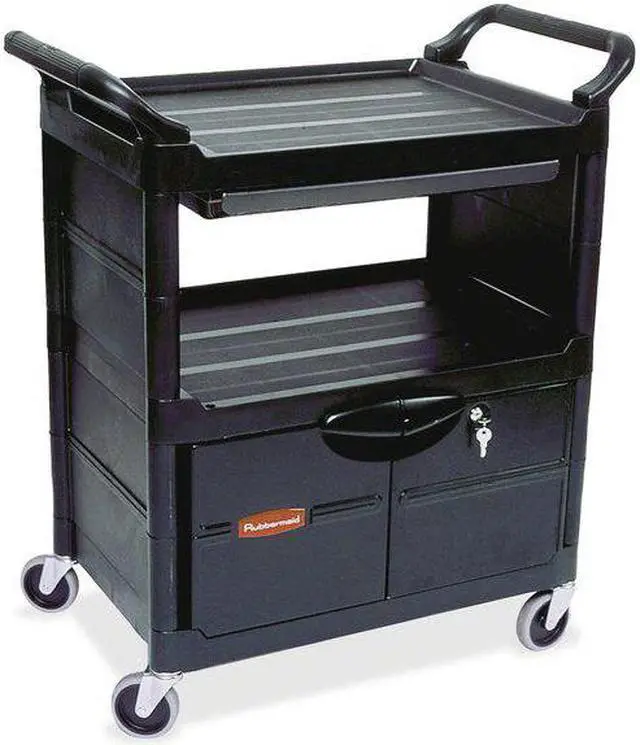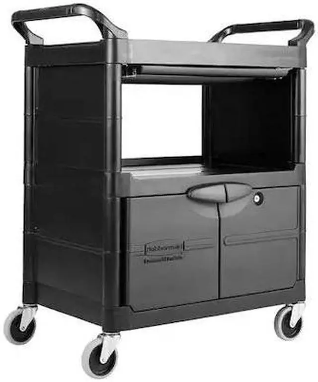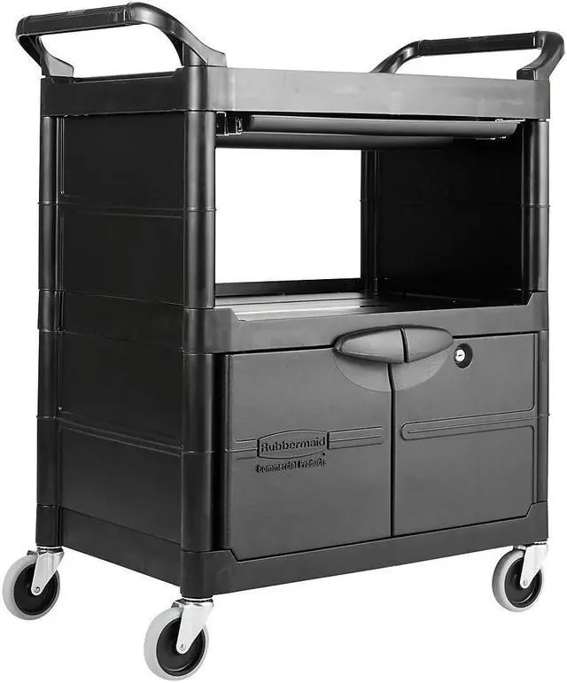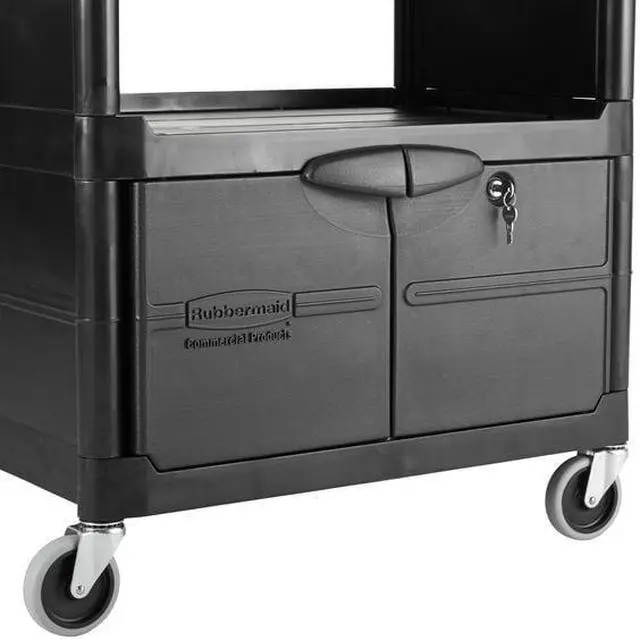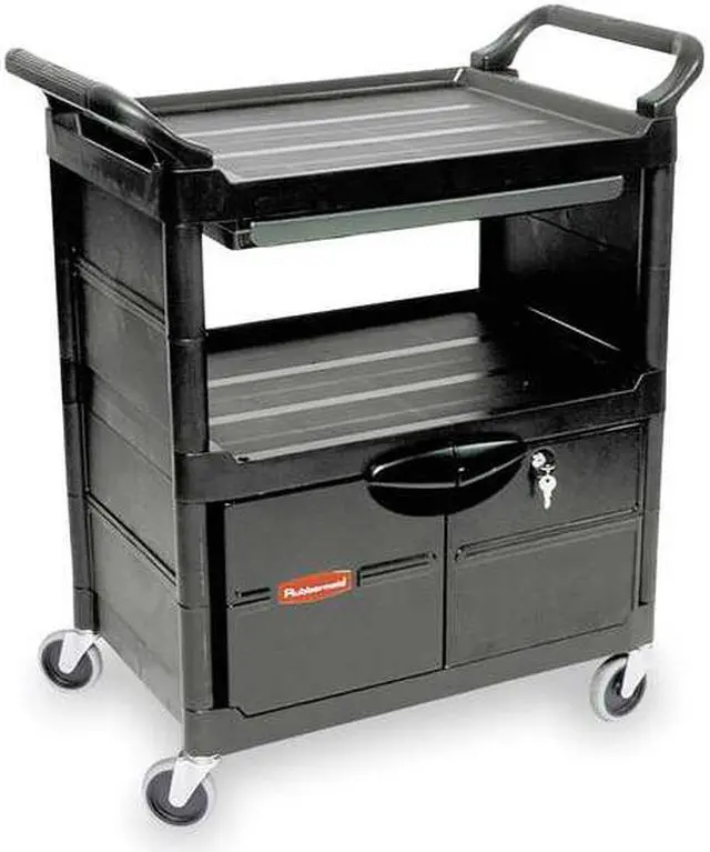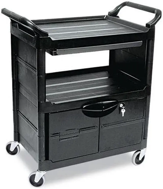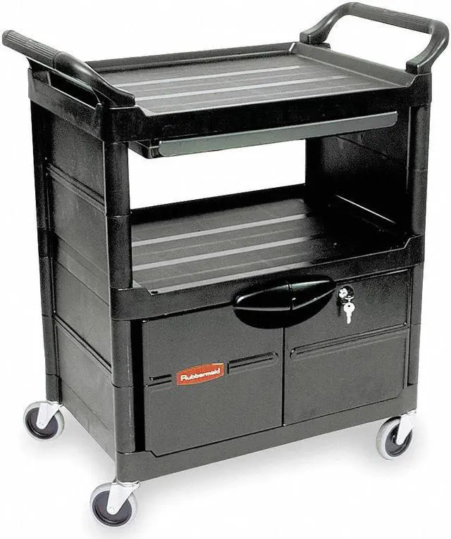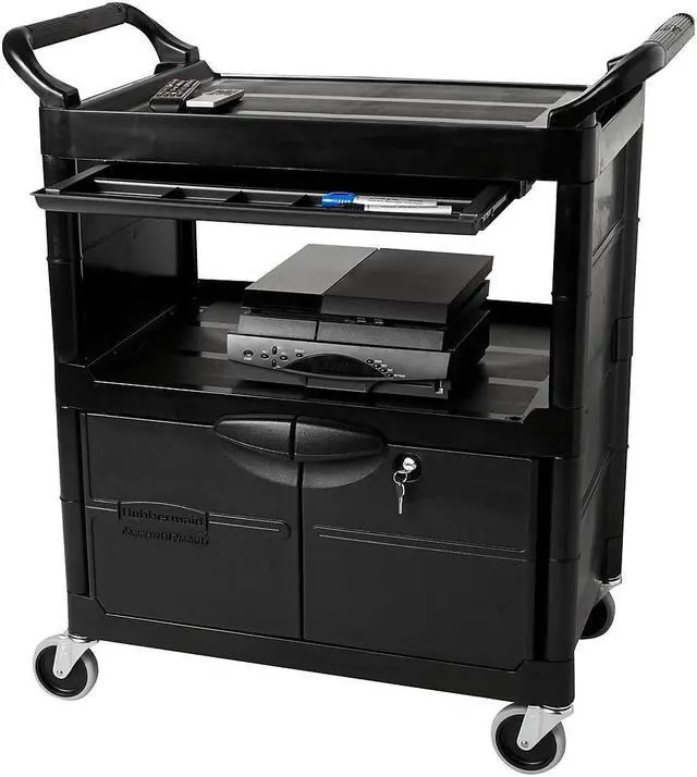 Won't rust, dent, chip or peel. Lightweight for easy maneuverability and quiet operation. No sharp edges to nick walls or furniture. Two-shelf cart with a sliding drawer beneath the top shelf and two locking doors beneath the bottom shelf.