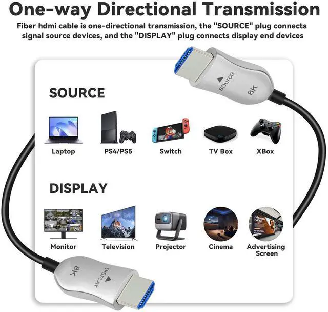- Unidirectional Transmission -- Fiber optic hdmi cable is one-directional transmission. The plugs at each end are marked "SOURCE" and "DISPLAY". The "SOURCE" plug connects signal source devices such as TV Box, PS5, PS4, PS3, Blu-ray Players, Xbox Series, Laptop etc. The "DISPLAY" plug connects display end devices such as TV, Displays, Projector, Moniter etc. Please make sure you plug in each end correctly, you will not get signal from the device.