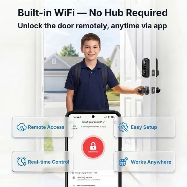 Built-in Wi-Fi & Remote Access: This smart lock connects directly to your network with no hub required. When a guest or family member presses the doorbell button, youll receive an instant unlock request on your phone, allowing you to grant entry from anywhere. You could also easily set up and manage access on the App