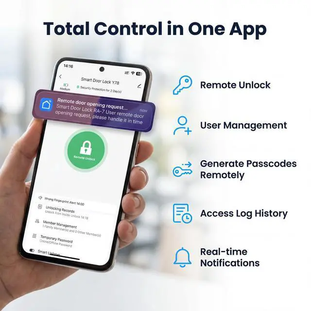 App Management: You could manage user permissions, generate temporary passcodes, and track access history all through the App. Staying informed is easier with instant mobile notifications that help you keep track of who enters and leaves. By centralizing key security features on your smartphone, managing your home access becomes more convenient and streamlined