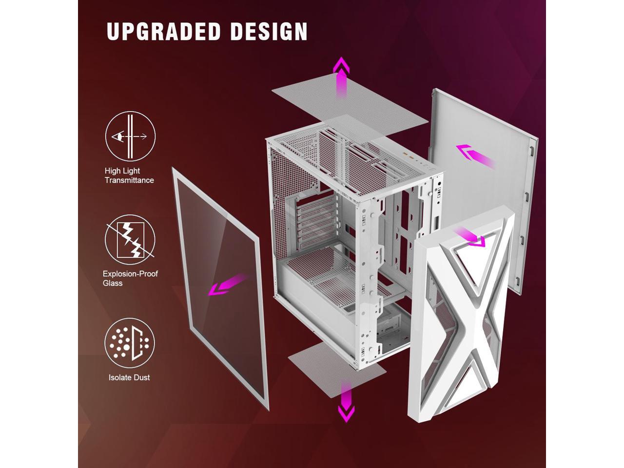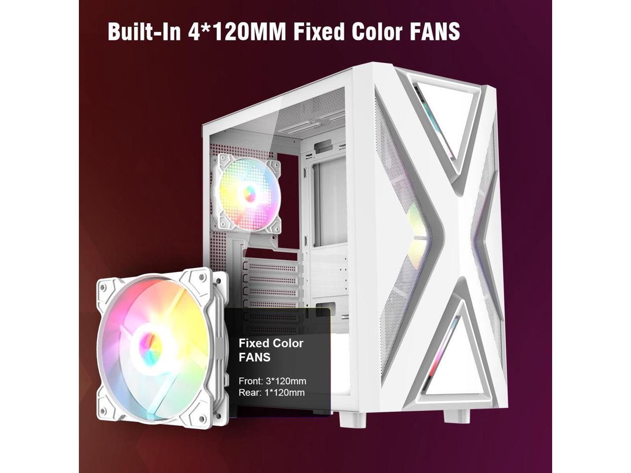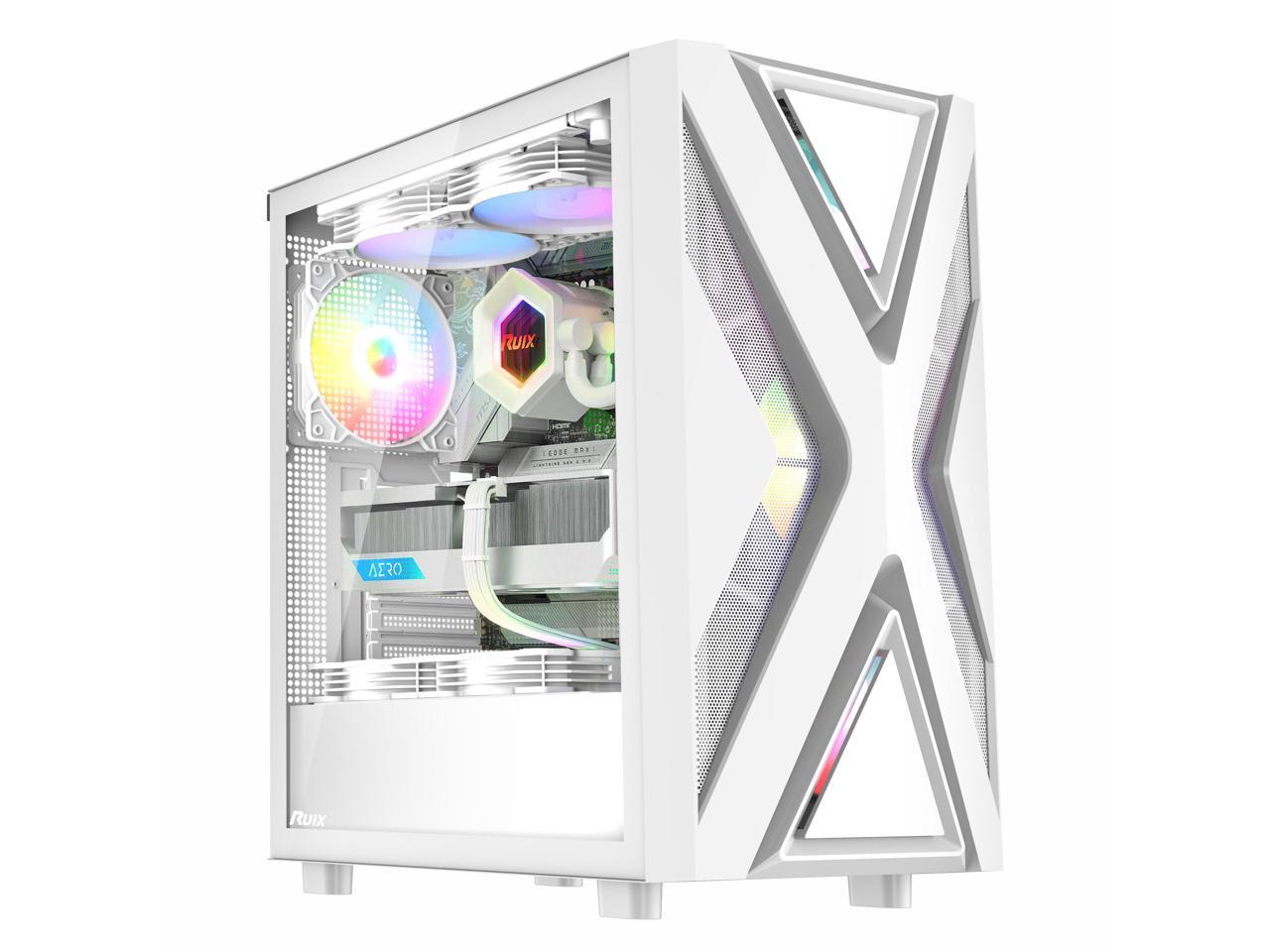 Ruix CV203 ATX Computer Gaming PC Case Mid Tower White With 4 Fans Fixed Rainbow 120mm Pre-Installed,Tempered Glass Side Panel USB3.0 Perfect Air Vent