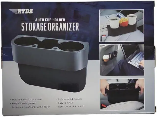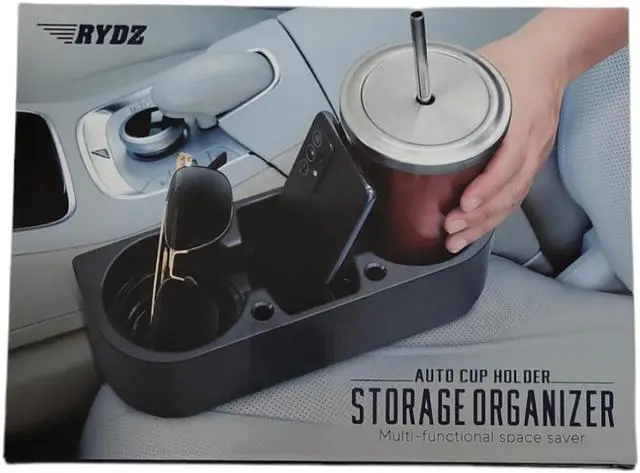 RYDZ Auto Cup Holder Storage Drinks Cellphones Organizer. With multiple compartments and a sturdy construction our Cup Holder Storage Organizer maximizes the use of your car's cup holders. It provides ample space to store various items such as beverages smartphones sunglasses pens loose change keys and more. Say goodbye to rummaging through your car's console or struggling to find a designated spot for your essentials. Everything you need will be within arm's reach Black Medium