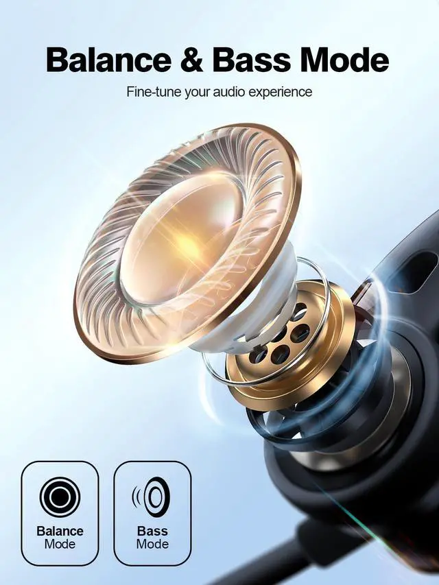 One-Press Dual EQ: Switch between 2 Music Modes effortlesslyBalanced Mode for clear, all-range audio (great for podcasts, audiobooks, or daily commutes) and Bass Mode for powerful, punchy low-end. It fuels your performance perfectly for fitness, gaming, or vibing to your favorite tracks