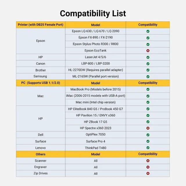 | Included Components | 1 x USB to DB25 Female Parallel Printer Cable |