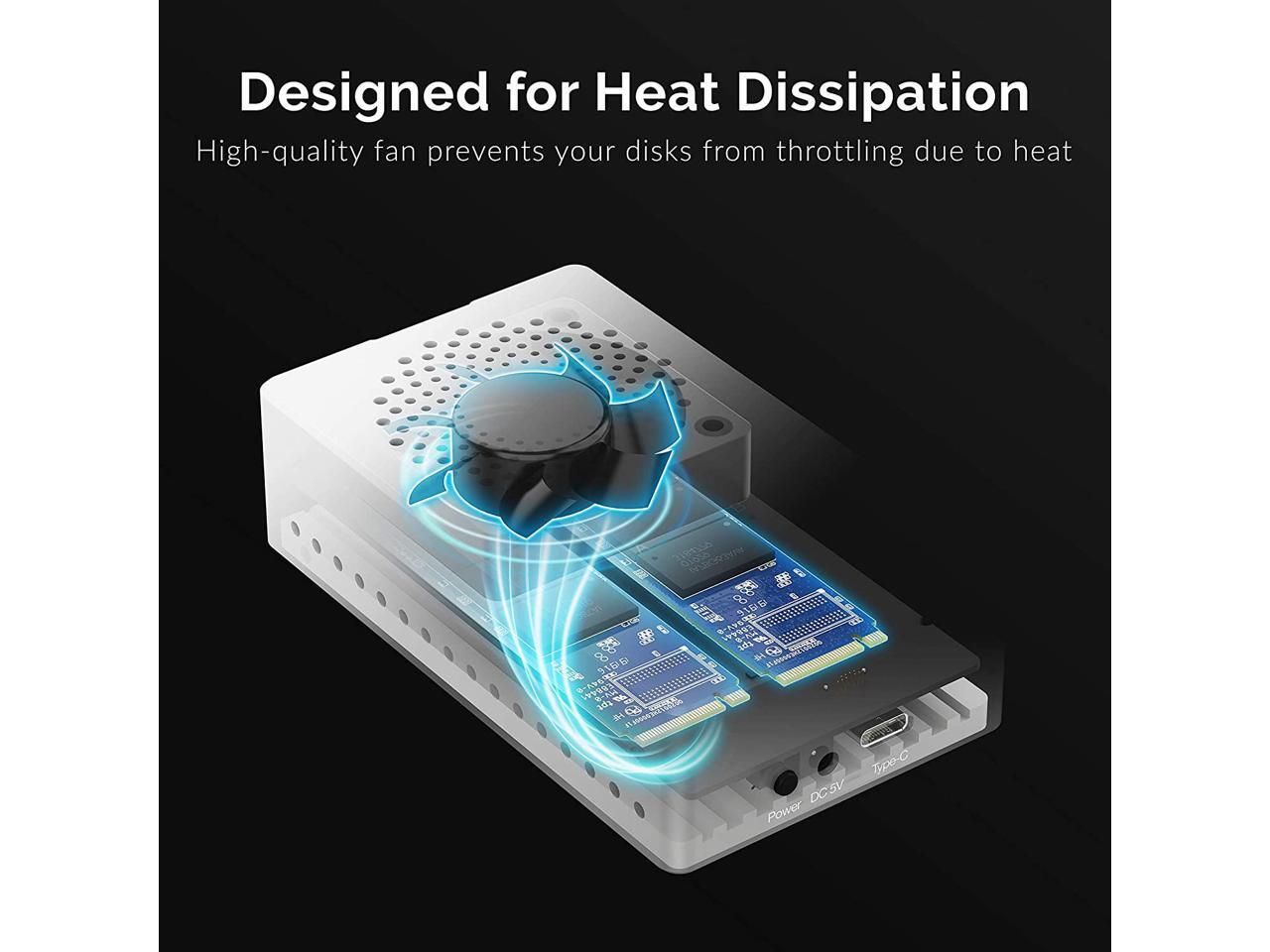 - DESIGN: Full aluminum construction for maximum heat dissipation. Built-in cooling fan will prevent your disks from throttling due to high temperature.