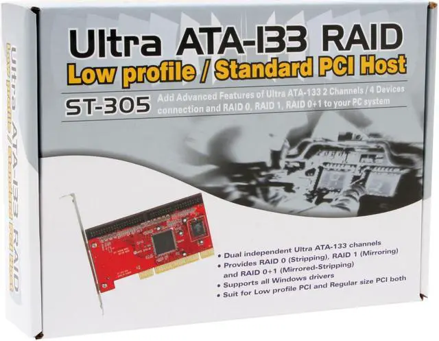 | Features | Silicon Image SIL680 Ultra ATA/133 IDE controller chipset Compliant with UDMA6 ATA/133 specification Compliant with ATA/ATAPI-6 specification Compliant with PCI Specification Version 2.2 Compliant with Programming Interface for Bus Master IDE Controller Rev 1.0 PCI “Plug&Play” compatibility Supports 48-bit sector addressing (maximumHD drive size is 131,072 TB) Connect up to four IDE/ATAdevices (Coexists with other on-board IDE controllers) Fully backwards compatible with Ultra ATA/100, Ultra ATA/66, Ultra ATA/33, EIDE/Fast ATA-2, IDE and ATAPI devices Automatic performance tuning for each device attached Supports Ultra and Multi-Word DMAtiming modes Enhanced data integrity of transferred data with CRC (Cyclical Redundancy Check) protection and verification |
