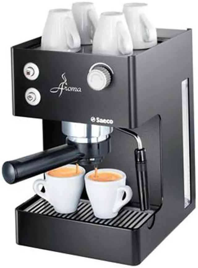 | Features | Saeco AROMA Espresso & Cappuccino Machine traditional Italian-made espresso machine is a great addition to any kitchen. Featuring a sturdy all-metal body, this machine is designed to last. The steam wand allows you to froth milk quickly and easily, and even dispenses hot water for tea. Create all of your favorite coffee drinks, such as cappuccinos, lattes, and mochas. It includes a pressurized Portafilter, making traditional espresso brewing simple and easy. By releasing the water pressure at the correct moment, it ensures a perfect extraction and a thick layer of crema every time. A brew switch can be controlled to regulate the amount and strength of the coffee. It even features a cup-warming surface to store and display porcelain cups. Beautifully designed and constructed, the Aroma espresso machine offers the ultimate coffee experience. |