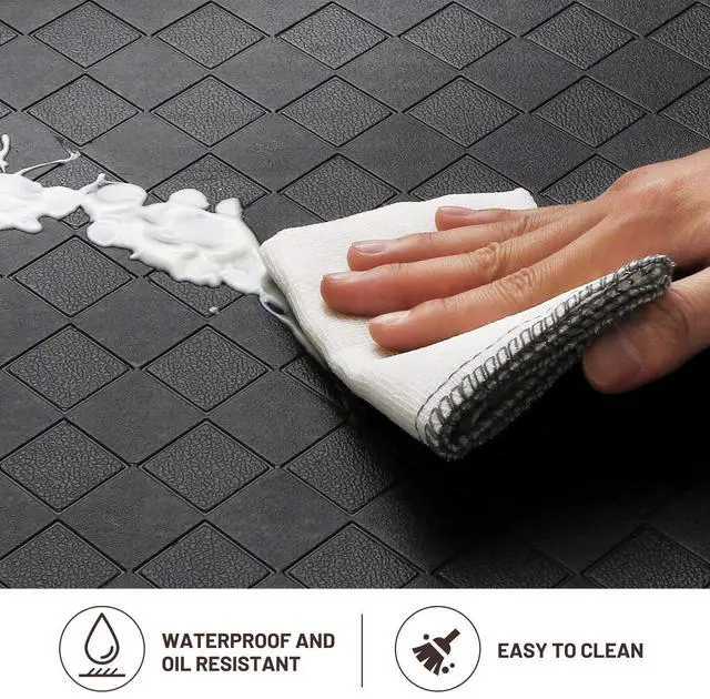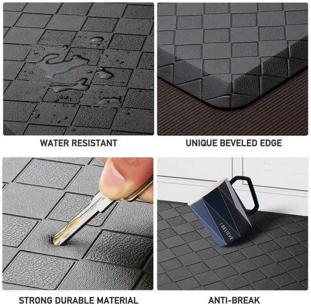 Water Resistant:Our anti-fatigue mats are made of premium quality PVC material making it convenient to clean up and will not collect dirt;The material repels water,oils or stains and if anything spills,it makes an effortless clean up;Grid pattern surface never wrinkles and gives a premium texture without collecting debris
