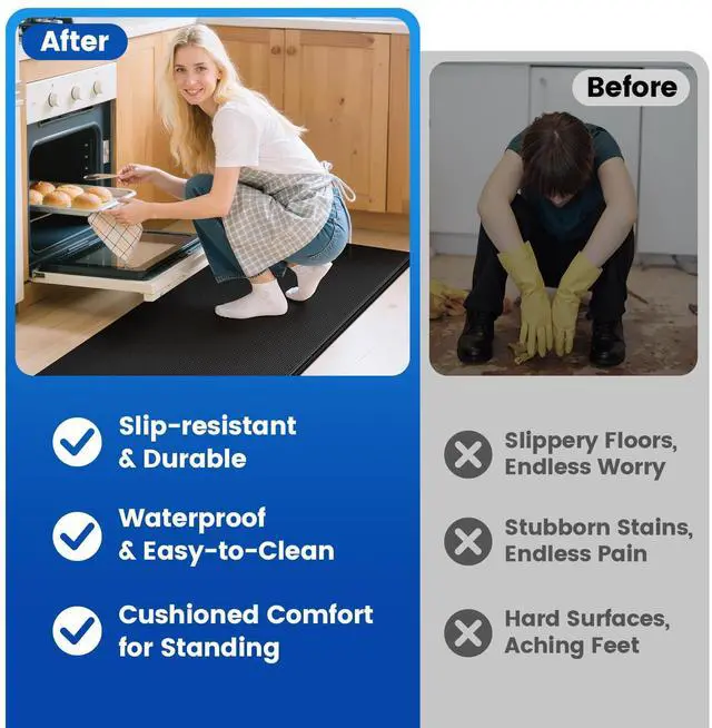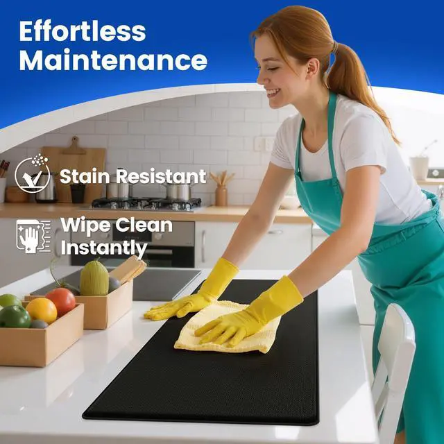 Easy-Clean Surface: Designed to resist stains, our kitchen mats make cleanup a breeze. Just use a damp cloth to wipe off any spills, from water to wine and more