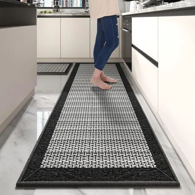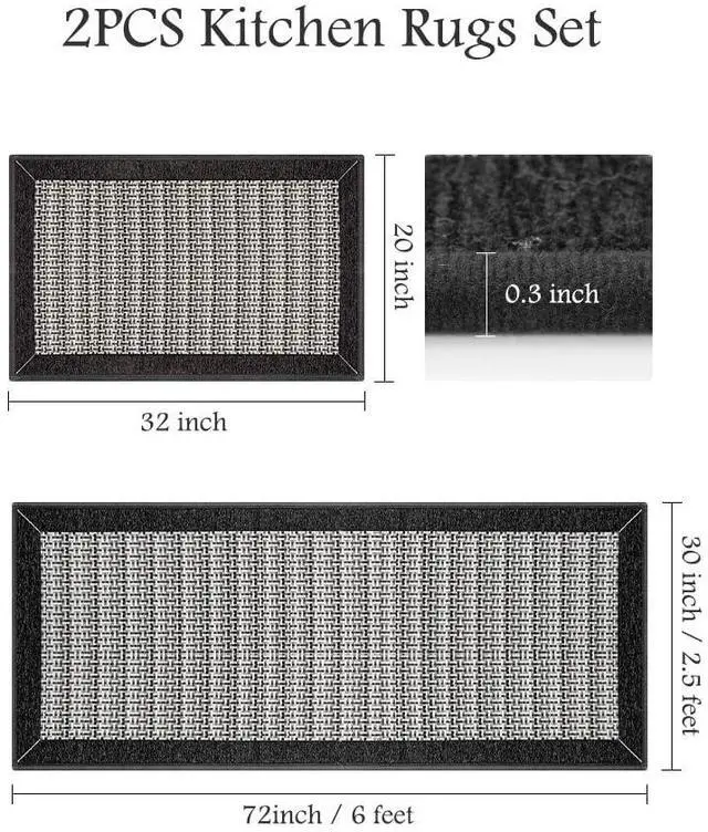 2 PCS Kitchen Rugs Mats Non Skid Washable - 2.5'x6' + 20"x32" Kitchen Rugs Sets of 2, Long Kitchen Runners Farmhouse Style,Weave Floor Mats for in Front of Sink Black