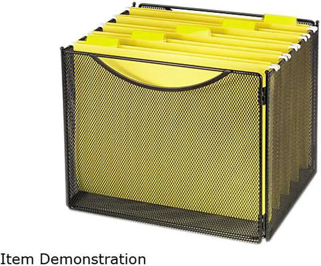 Portable file box with integrated handles features an open top for letter-size hanging files. Collapsible for easy storage when not in use. Durable steel mesh design with black powder-coat finish. Box Type: File Storage; Strength: Heavy-Duty; File Size Format: Letter; Width: 12.5".