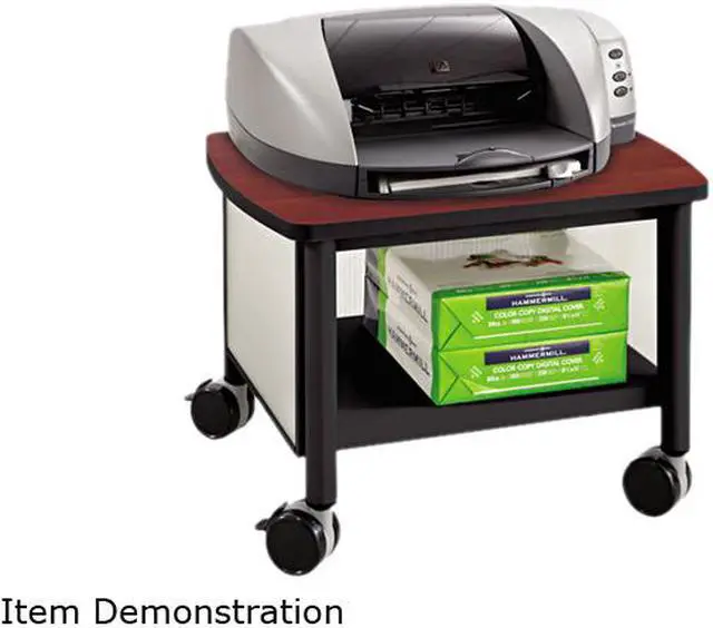 Use Machine Stand to free up additonal desk space and keep supplies close and organized. Powder coat steel frame for durability with translucent polycarbonate side and back panels. Accommodates most office machines. Large storage area with one fixed shelf. Four casters (two locking) for easy mobility. Under-Desk Design. Material(s): Laminated Engineered Wood; Polycarbonate; Steel; Overall Material Type: Metal; Color: Cherry/White/Black; Color Family: Cherry.