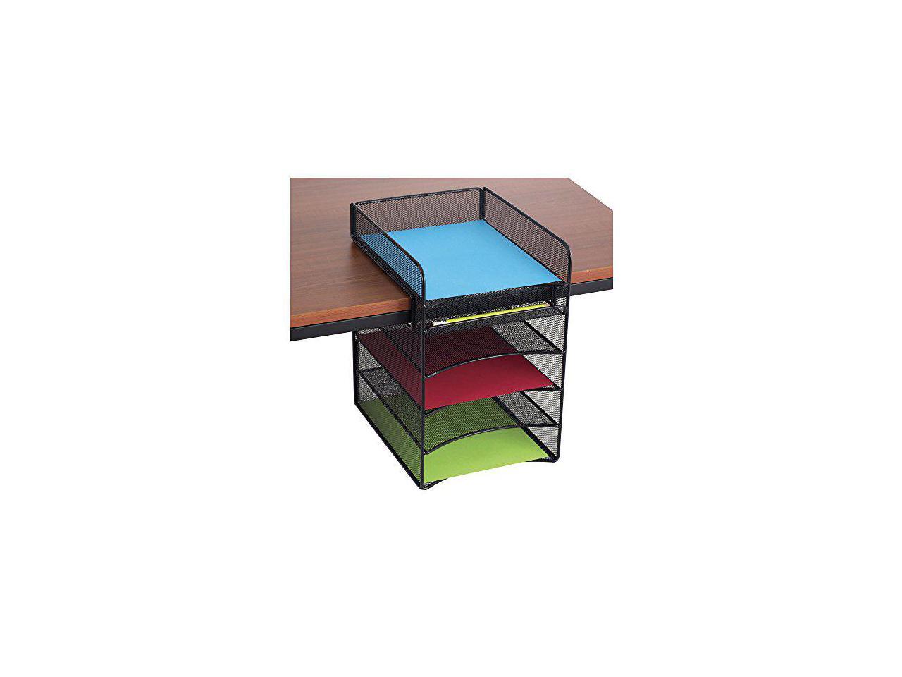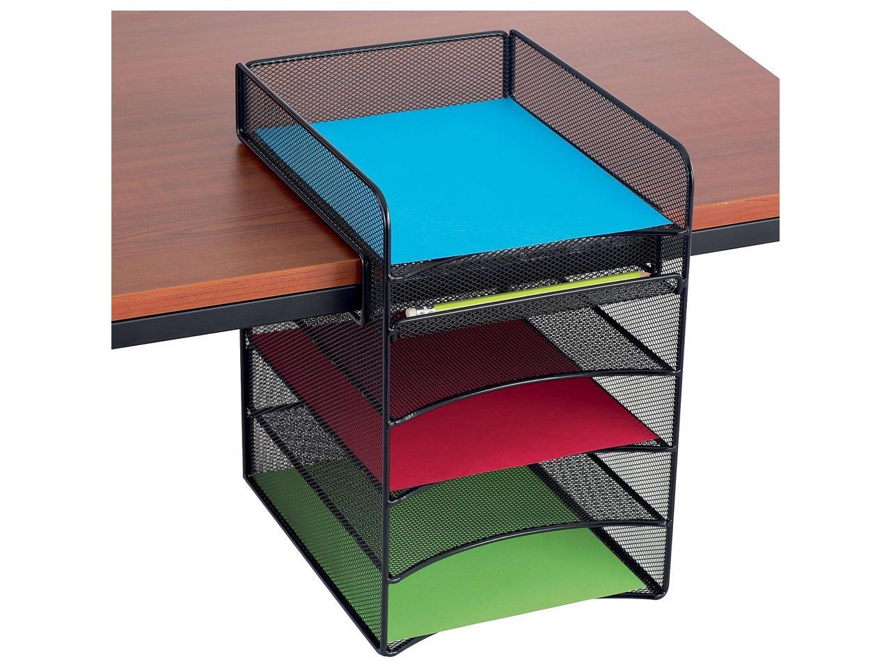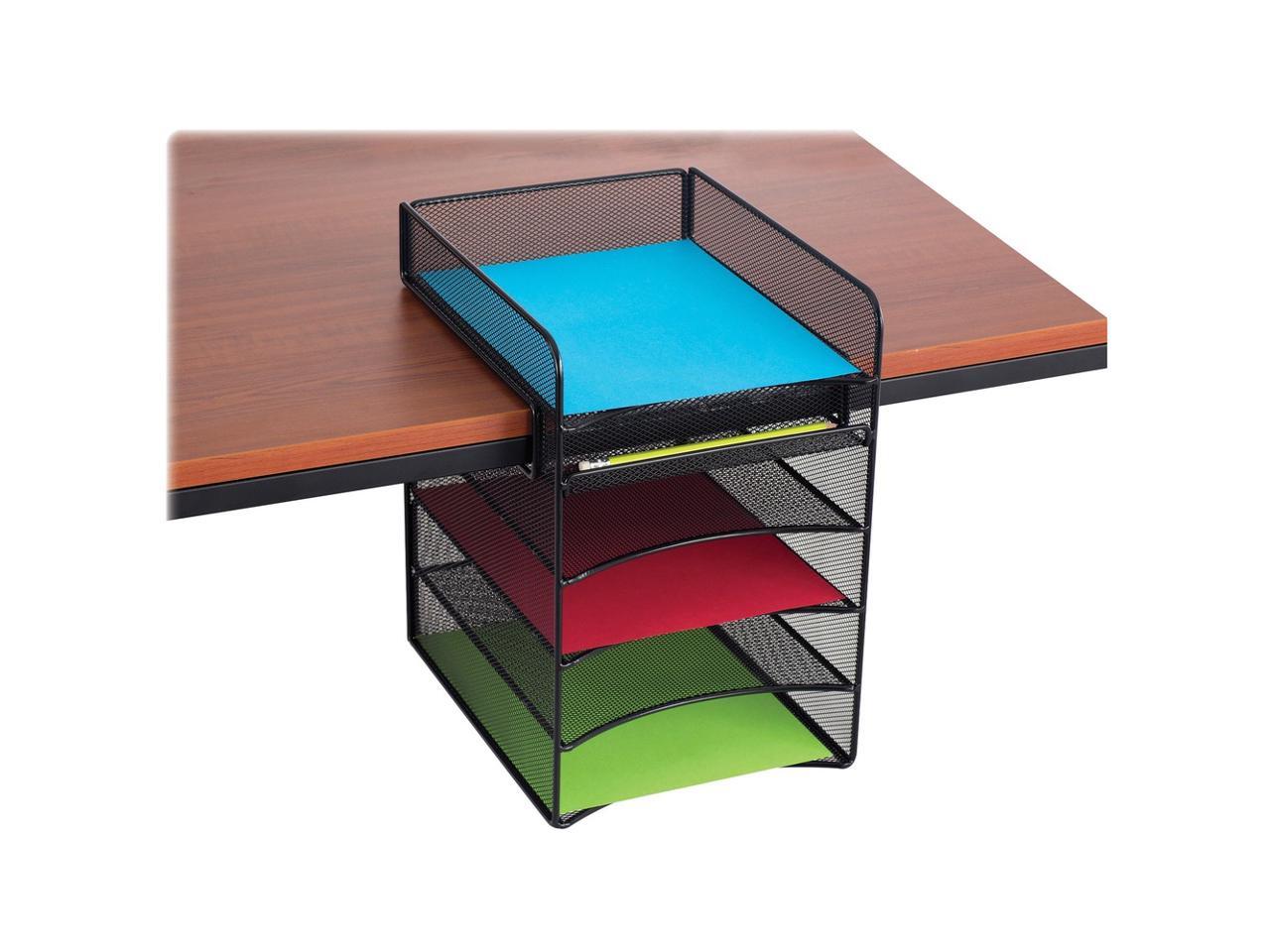 Wire mesh, hanging organizer that attaches to desktop and hangs to provide underdesk storage. Features 1 desktop tray and 4 underdesk trays for sorting letter-size documents. Durable, lightweight, steel mesh construction with scratch-resistant Black powder coat finish and attractively rolled edges.