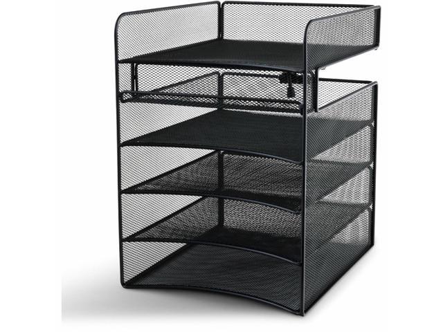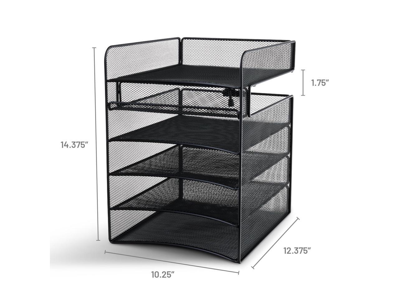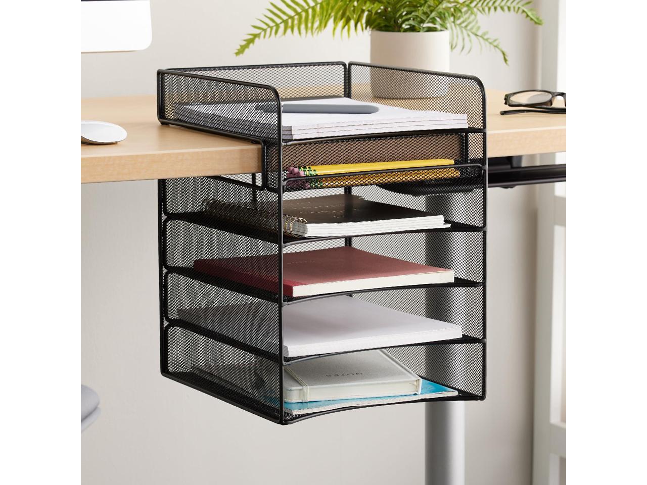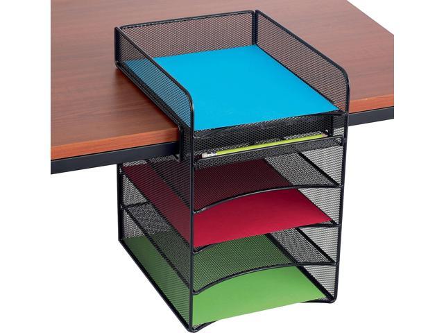 Wire mesh, hanging organizer that attaches to desktop and hangs to provide underdesk storage. Features 1 desktop tray and 4 underdesk trays for sorting letter-size documents. Durable, lightweight, steel mesh construction with scratch-resistant Black powder coat finish and attractively rolled edges.