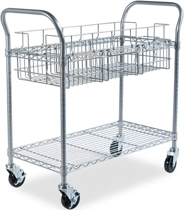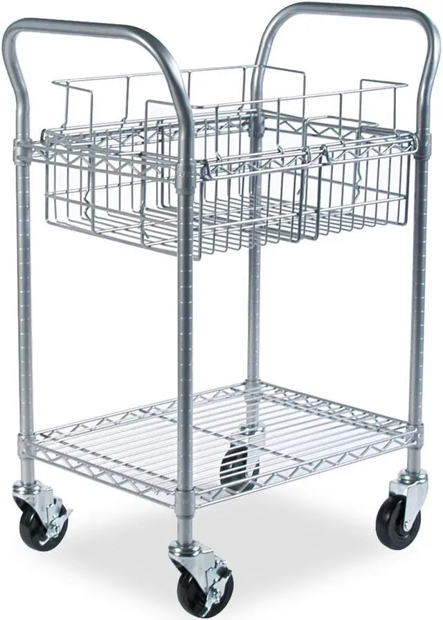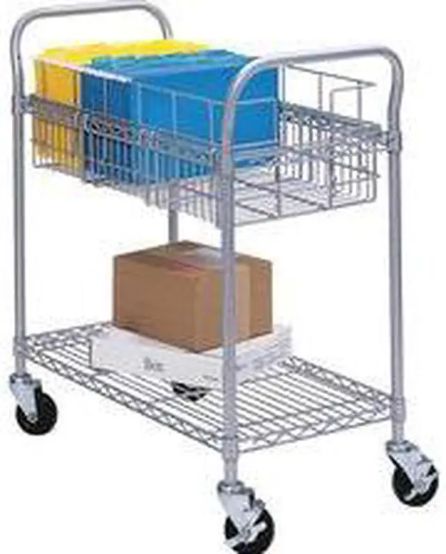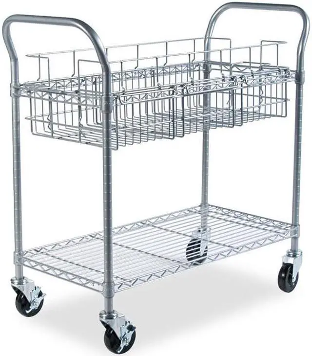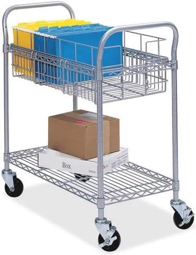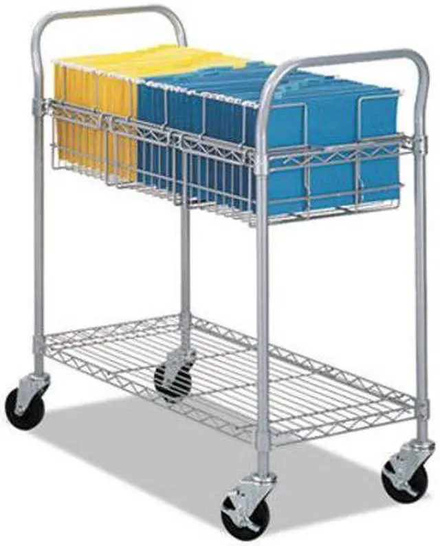 Heavy-duty steel, welded wire construction. Top basket holds legal-size hanging folders. Convenient dual handles. Bottom shelf for bulk mail and parcels. Mobile on four casters (two locking). Dual-Purpose FormatCarts basket can also accommodate up to 150 hanging file folders when employing legal-sized hangers. Material(s): Steel Wire; Overall Material Type: Metal; Color: Metallic Gray; Color Family: Gray.