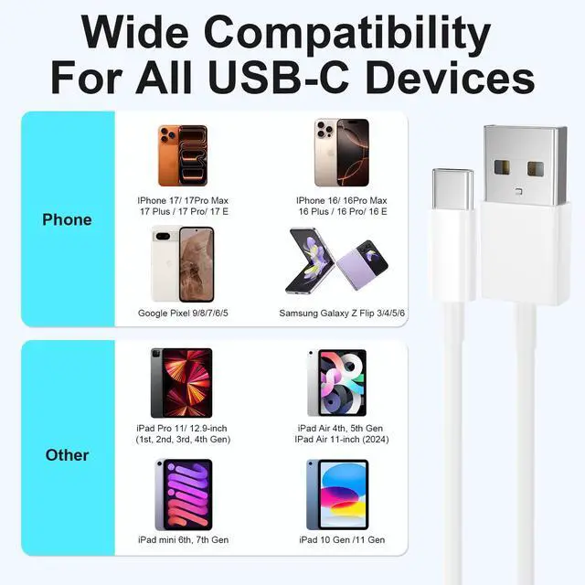 WIDE COMPATIBILITY: the usb a to usb c cable 3ft is compatible with a wide range of USB-C devices,, including apple iPhone 16/15/Plus/Pro/Pro Max, Samsung Galaxy S24/23/S22, Google Pixel 8/7 and other USB-C devices.