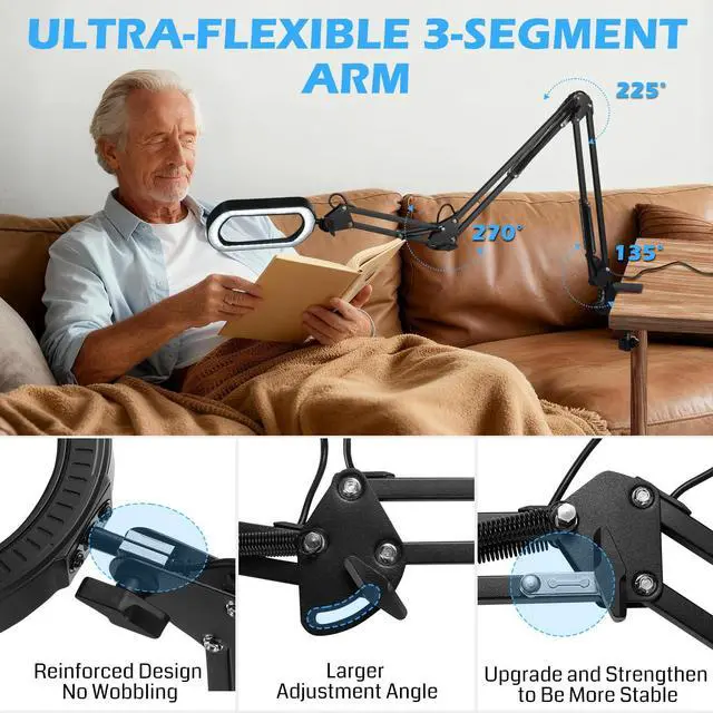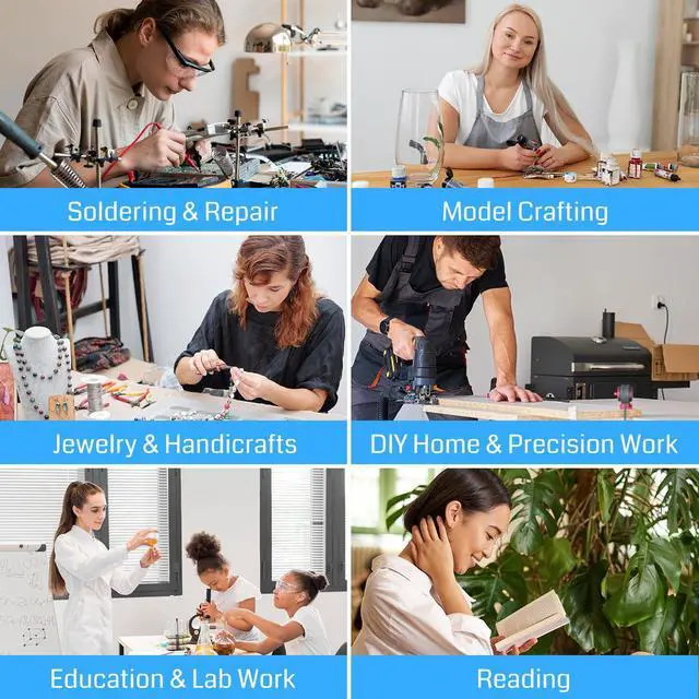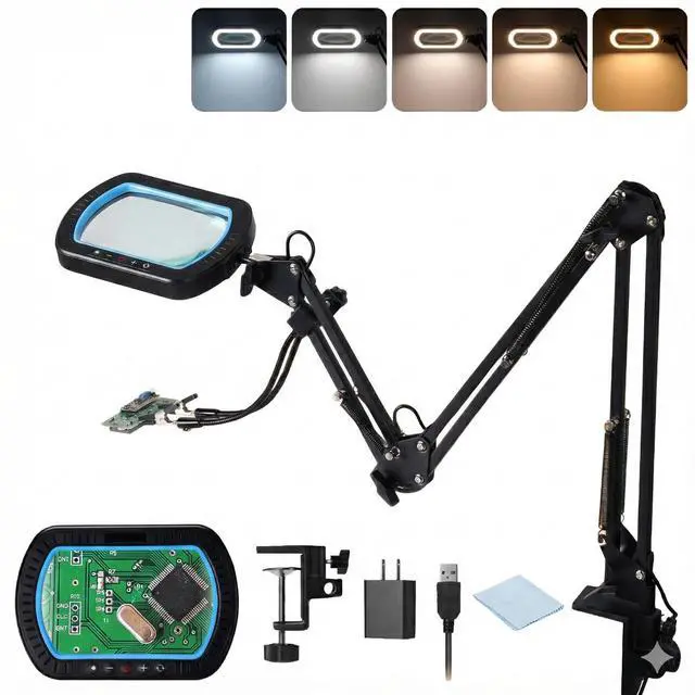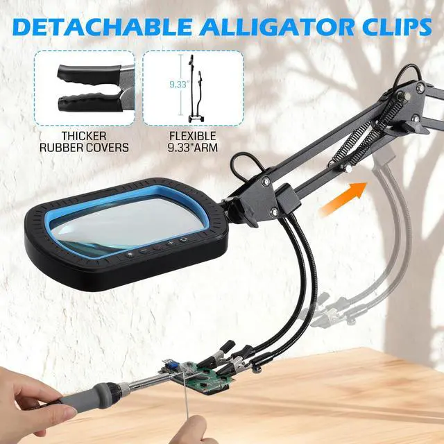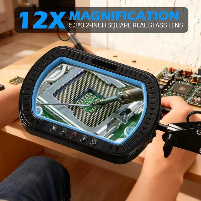 The SainSmart 12X Magnifying LED Work Light is engineered for precision, flexibility, and comfort. Featuring a large 5.3×3.2" square lens, it provides a wide, crystal-clear view of your work, ideal for electronics, soldering, jewelry, crafts, and model making. Magnifying glass with light equipped with 5000LM / 40W LED, the light is soft, flicker-free, and adjustable across 10 brightness levels and 5 color temperatures, with one-touch high brightness mode for instant strong illumination. Its 3-section adjustable arm allows maximum rotation angles of 270° / 225° / 135°, giving you precise positioning for any task. Detachable alligator clips with dual anti-slip pads securely hold workpieces, while 4-way clamping supports multiple mounting options. 99% pre-assembled, this work light is ready to use with minimal setup. Whether youre soldering PCBs, crafting miniatures, making jewelry, or engaging in STEM projects, the SainSmart work light ensures precision, comfort, and efficiency in every task.