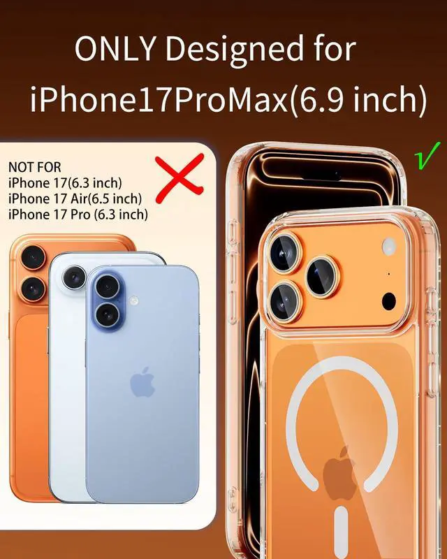 Saiuxiu for iPhone 17 Pro Max Caseyour ultimate fusion of style, protection, and smart functionality. Designed for the modern user who values both aesthetics and durability, this clear protective case blends transparency with military-grade resilience, ensuring your device stays sleek while gaining robust defense against daily wear. Built-in precision magnets deliver seamless MagSafe compatibility with chargers, wallets, and car mounts, offering a secure yet gentle hold without bulky adapters or misalignment. Crafted with advanced TPU material, it resists yellowing and discoloration, keeping your iPhone 17 Pro Max looking fresh and crystal-clear for months, fitting effortlessly into pockets, bags, or tight spaces. The raised bezel shields both front and back cameras from scratches, drops, and dust, and reinforced corners absorb impacts from accidental 12FT fallstested to withstand real-life bumps and knocks. Every case includes premium pre-cut screen and lens protectors, perfectly aligned with your case for double the defense against scratches, cracks, and smudges, adding a second layer of armor to your device. From precise cutouts for charging ports, volume buttons, and the speaker grille to the soft, fingerprint-resistant TPU frame, every detail is tailored to the iPhone 17 Pro Max, ensuring unrestricted access to all features while keeping smudges at bay. Whether commuting, working, or capturing memories, the Saiuxiu for iPhone 17 Pro Max Case is more than a coverits a reliable partner that protects, enhances, and adapts to your needs, ensuring your device stays as vibrant as you are.