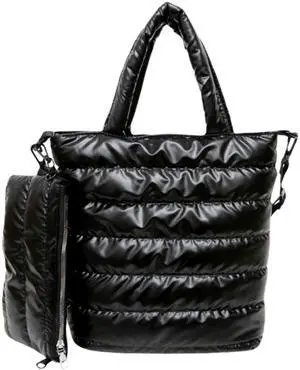 Quilted Metallic Lightweight Crossbody North South Tote Detachable Small Pouch, Puffer Bag Adjustable Strap, Shoulder Bag (Black)